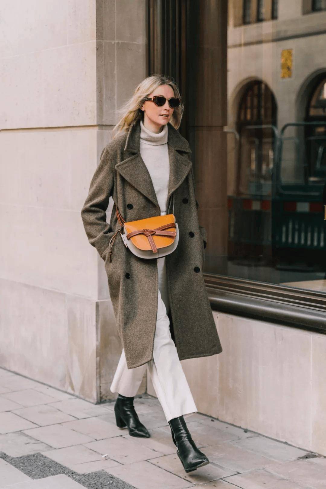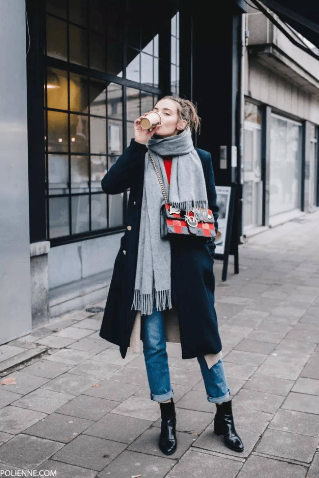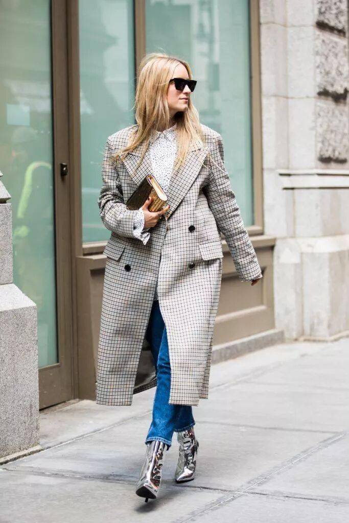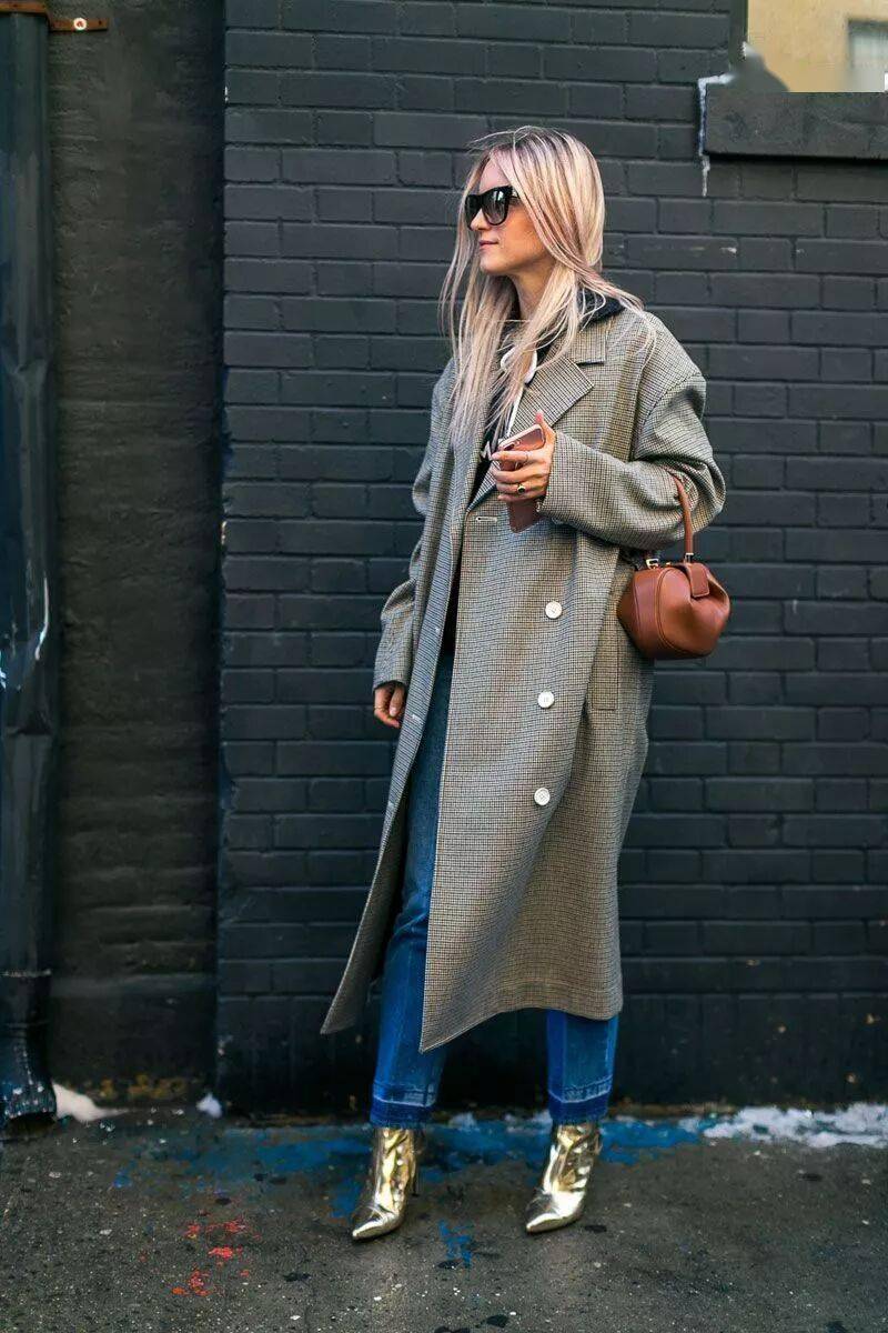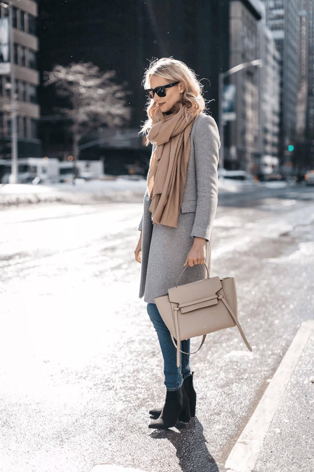 灰色大衣气质简约不挑人,而灰色大衣+牛仔裤+踝靴的组合可以说是冬季标配,在潮人街拍中素来有着很高的出镜率。当你不知道穿什么时候的,选择这组黄金搭配准没错。