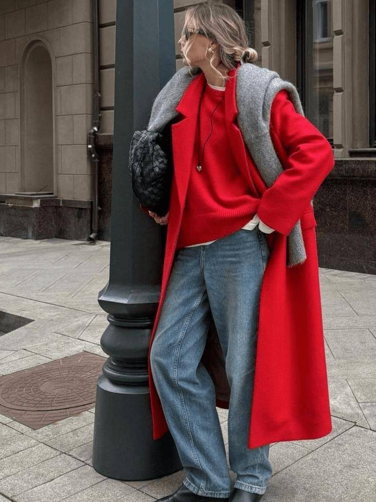 纯色大衣和牛仔裤都是非常简约百搭的基础款,因此内搭也就不用再拘泥于基础色。用颜色更鲜亮的毛衣、卫衣做内搭,更能给人眼前一亮的惊艳感与欣喜感。