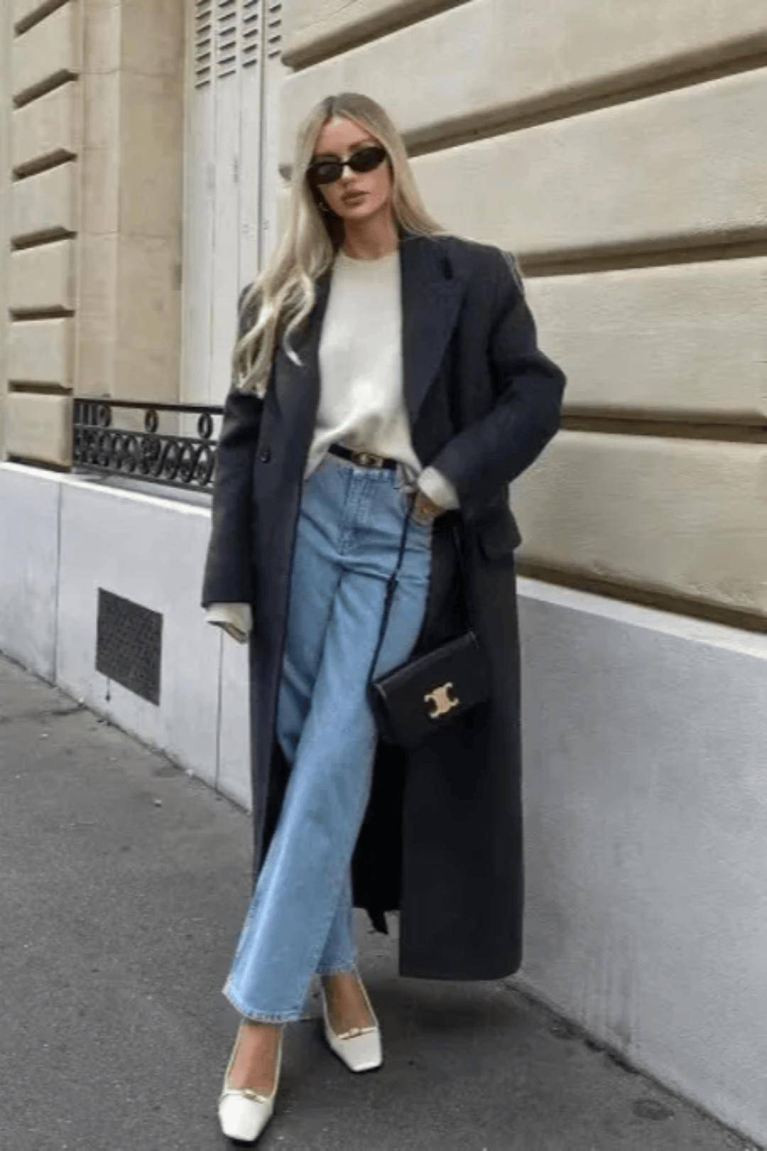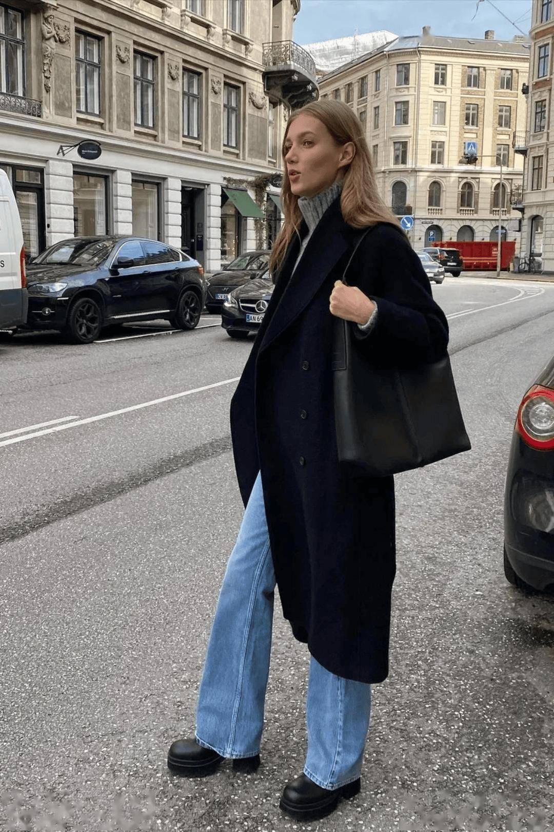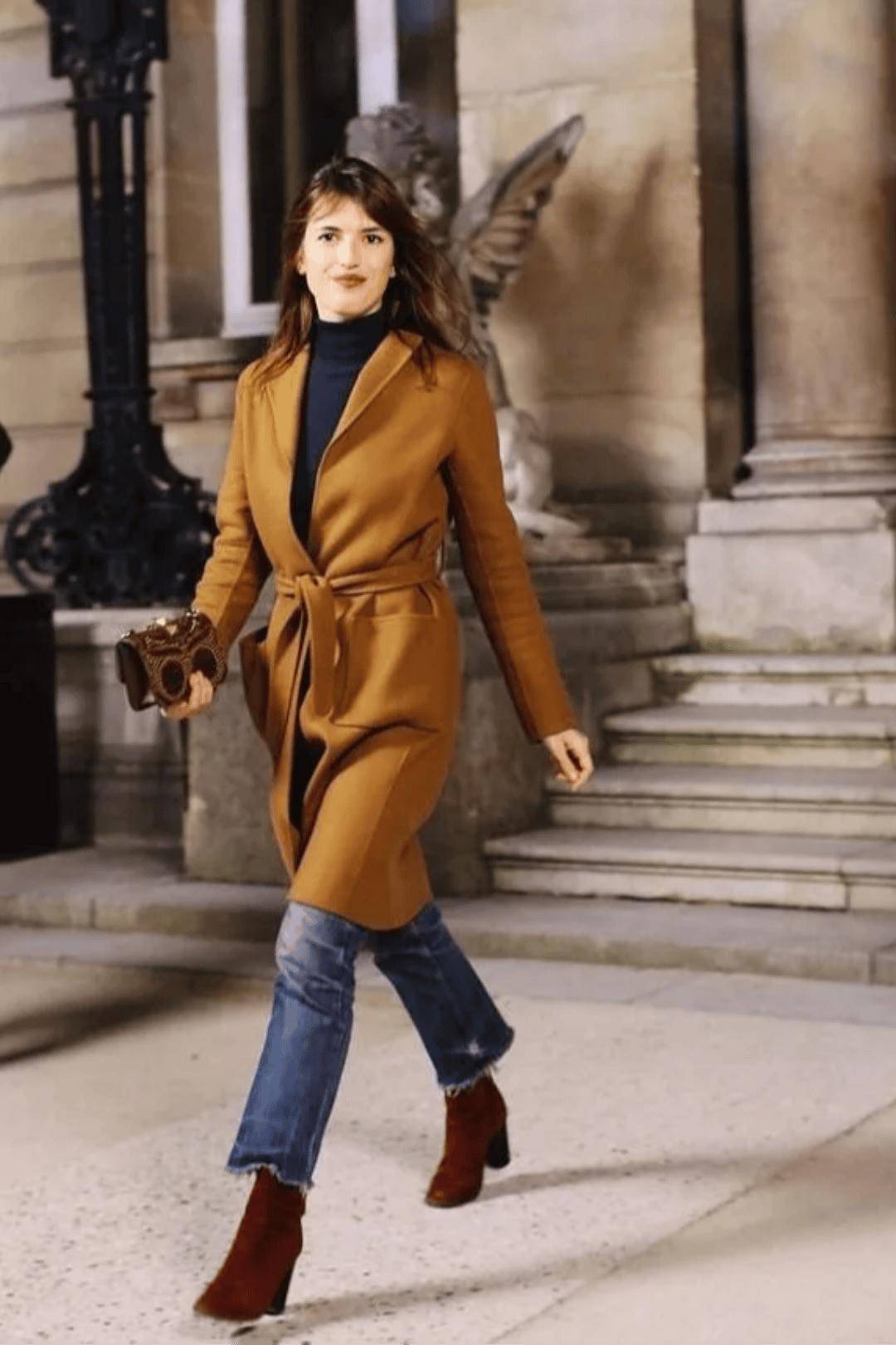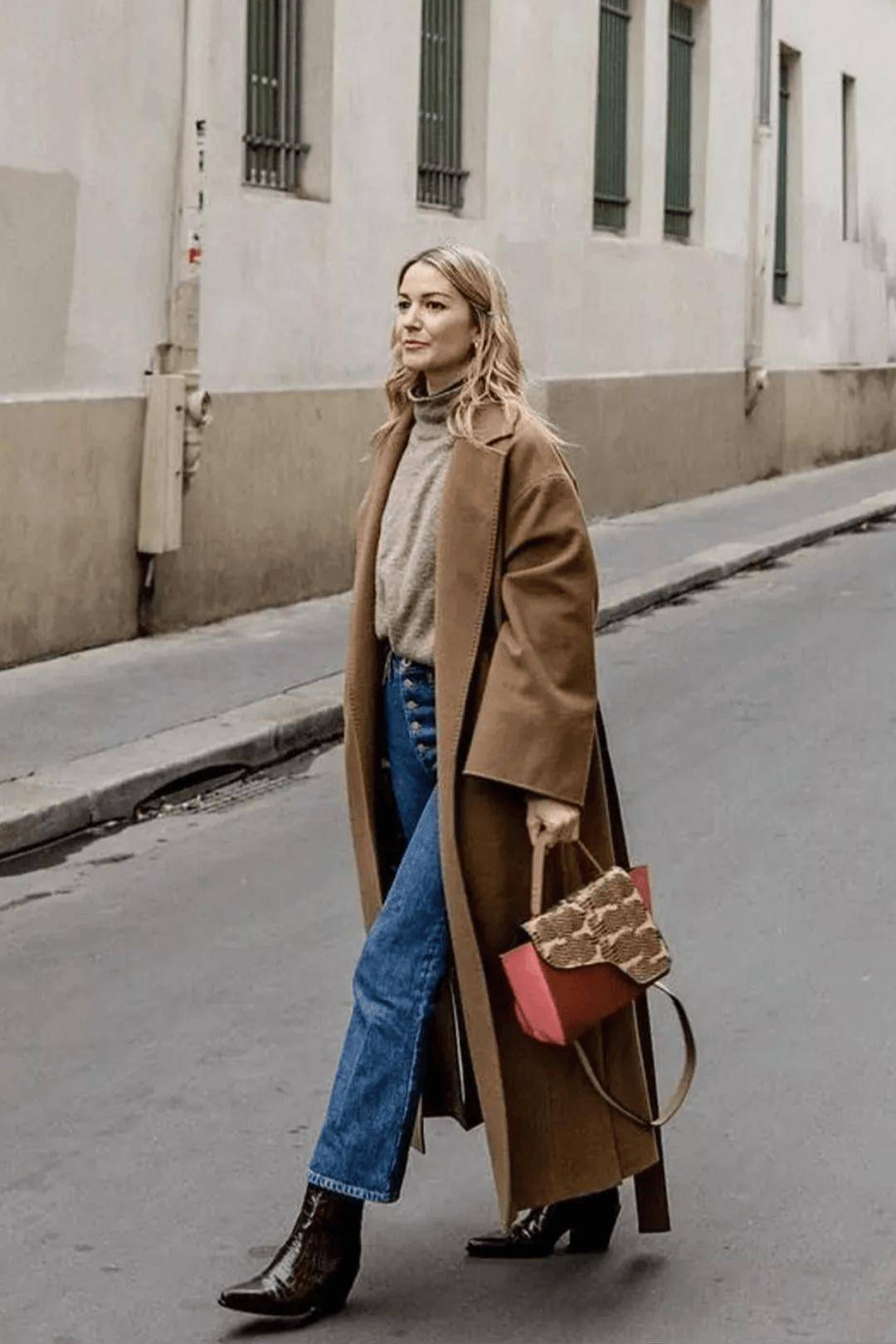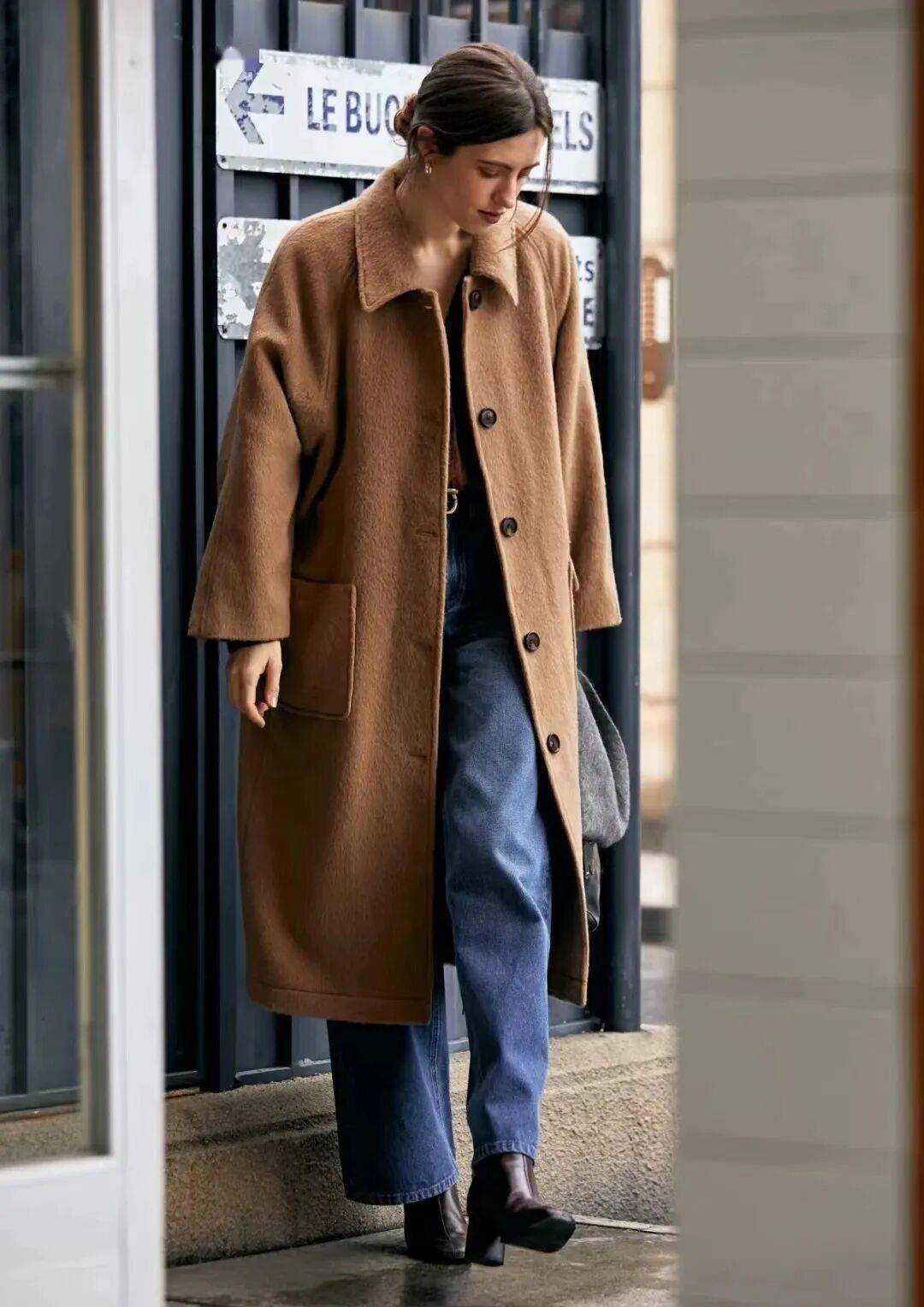 第一张图,这是一幅充满法式松弛感的日常街拍画面:女性身着驼色长款毛呢大衣,宽松版型衬出随性氛围,内搭深色衣物与阔腿牛仔裤,脚踩黑色短靴,整体穿搭是经典的大地色系组合,简约又高级。背景是带有路牌标识的建筑门口,略带复古的街景衬出慵懒的都市日常感,造型舒适且兼具时尚度,完美诠释了法式休闲的秋冬穿搭风格。
