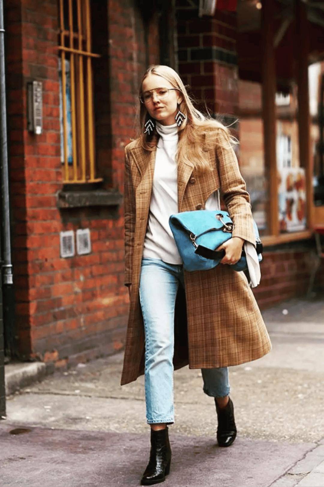 格纹大衣+牛仔裤+短靴