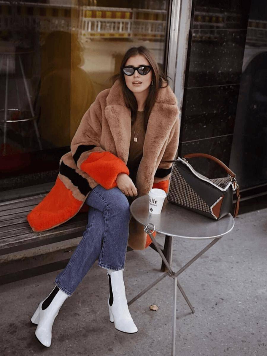 彩色大衣+牛仔裤+短靴