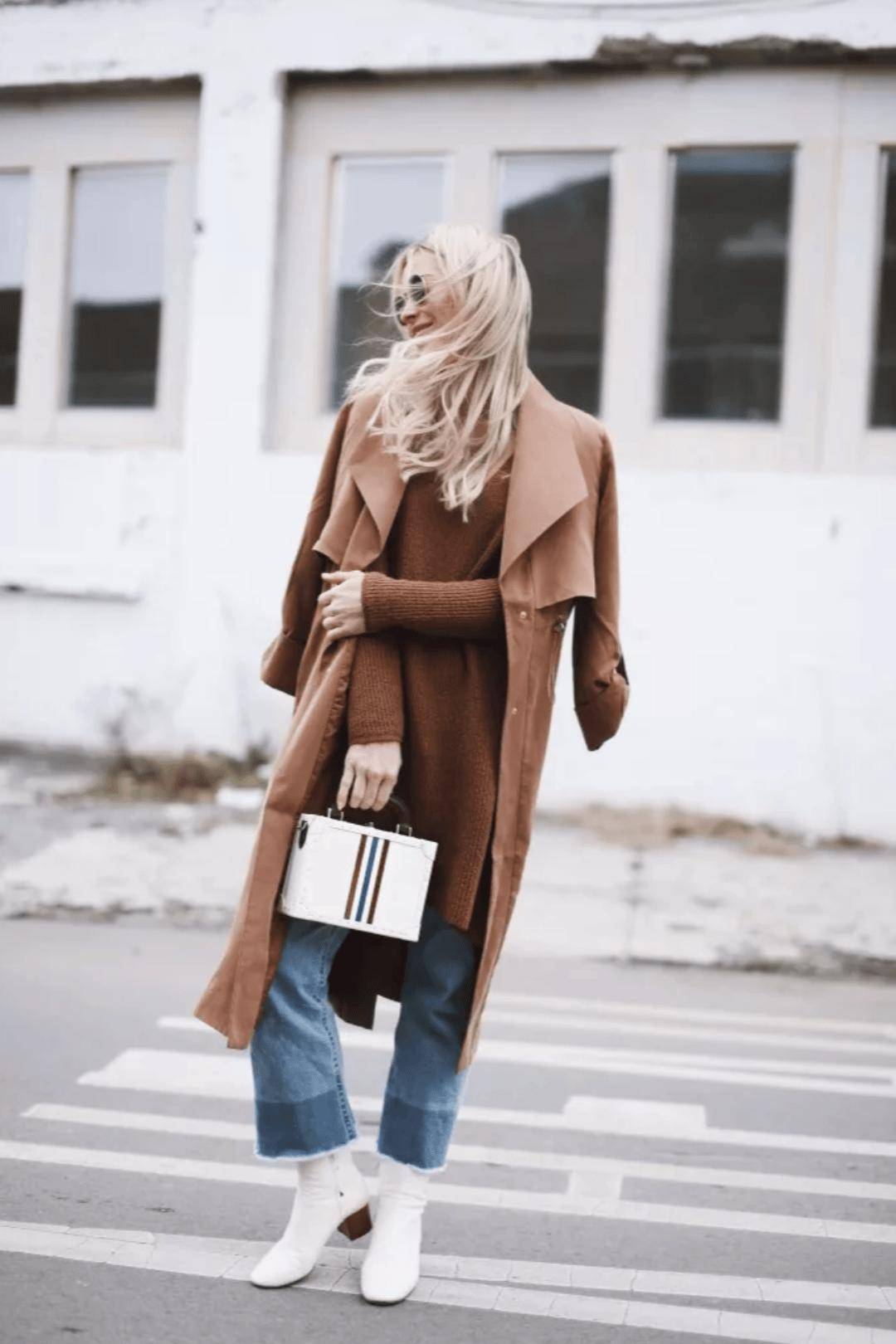 基础色大衣+牛仔裤+短靴