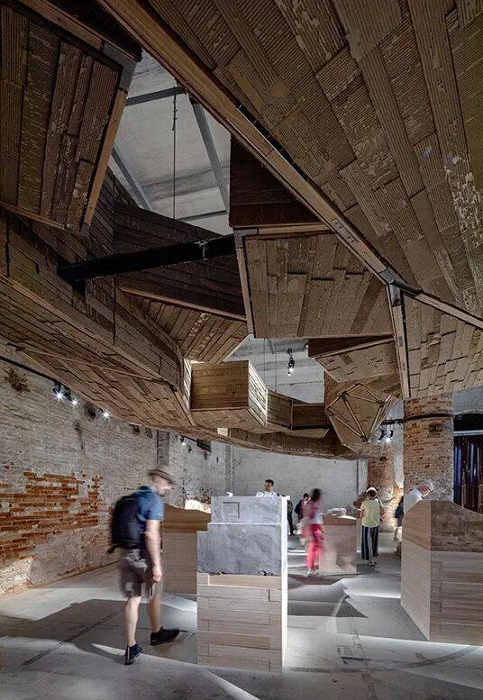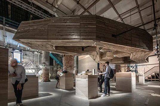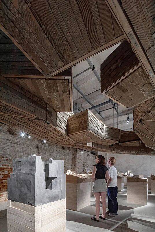 在 2023 年第 18 届威尼斯建筑双年展军械库主场馆的“共同生活”展览中,由肖峰艺术馆形体演绎而来的 15 米长木构装置成为了焦点之一。该装置悬挂在展区上方,其表皮由北京街头收集的纸箱制成,纸板表面经过手工撕开处理,产生了丰富而独特的质感。这种创意性的材料运用不仅体现了环保理念,更为装置增添了一份质朴与自然的气息。