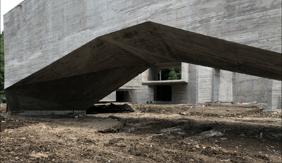 建筑主体采用掺入黑色墨水的混凝土现场浇筑而成。在自然光与人工照明的共同作用下,材质的统一性和曲折变化的雕塑感形体,与周围的自然环境形成了鲜明而生动的对比。