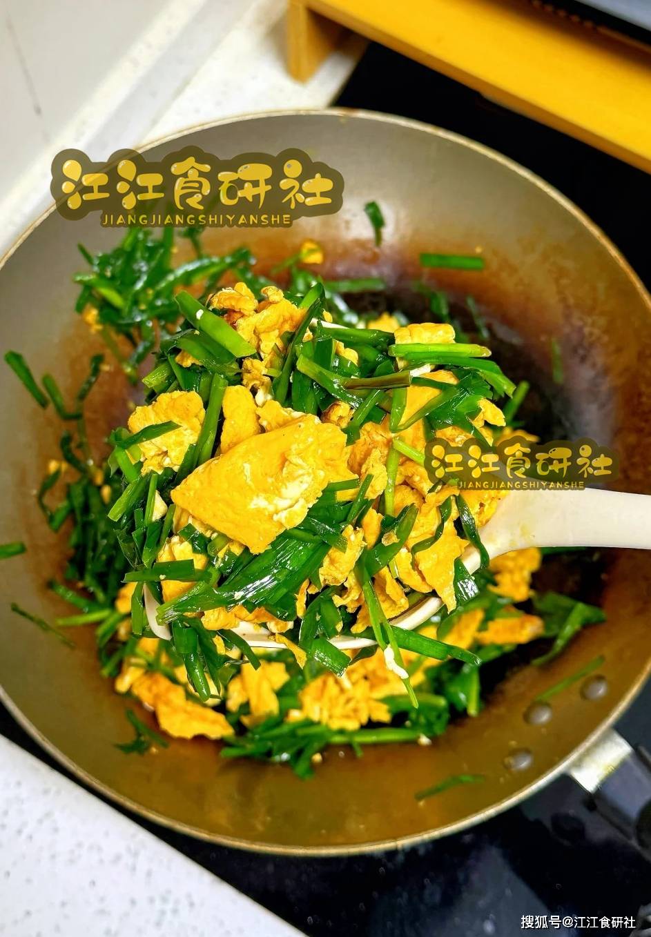调味要快。 韭菜叶一塌软,立刻倒入炒好的鸡蛋。只加盐,快速翻炒均匀,10秒钟内出锅。