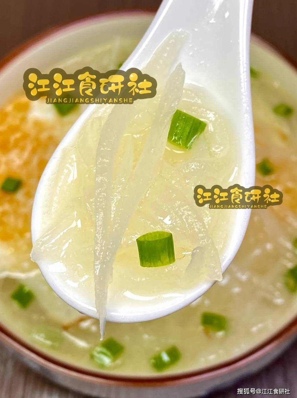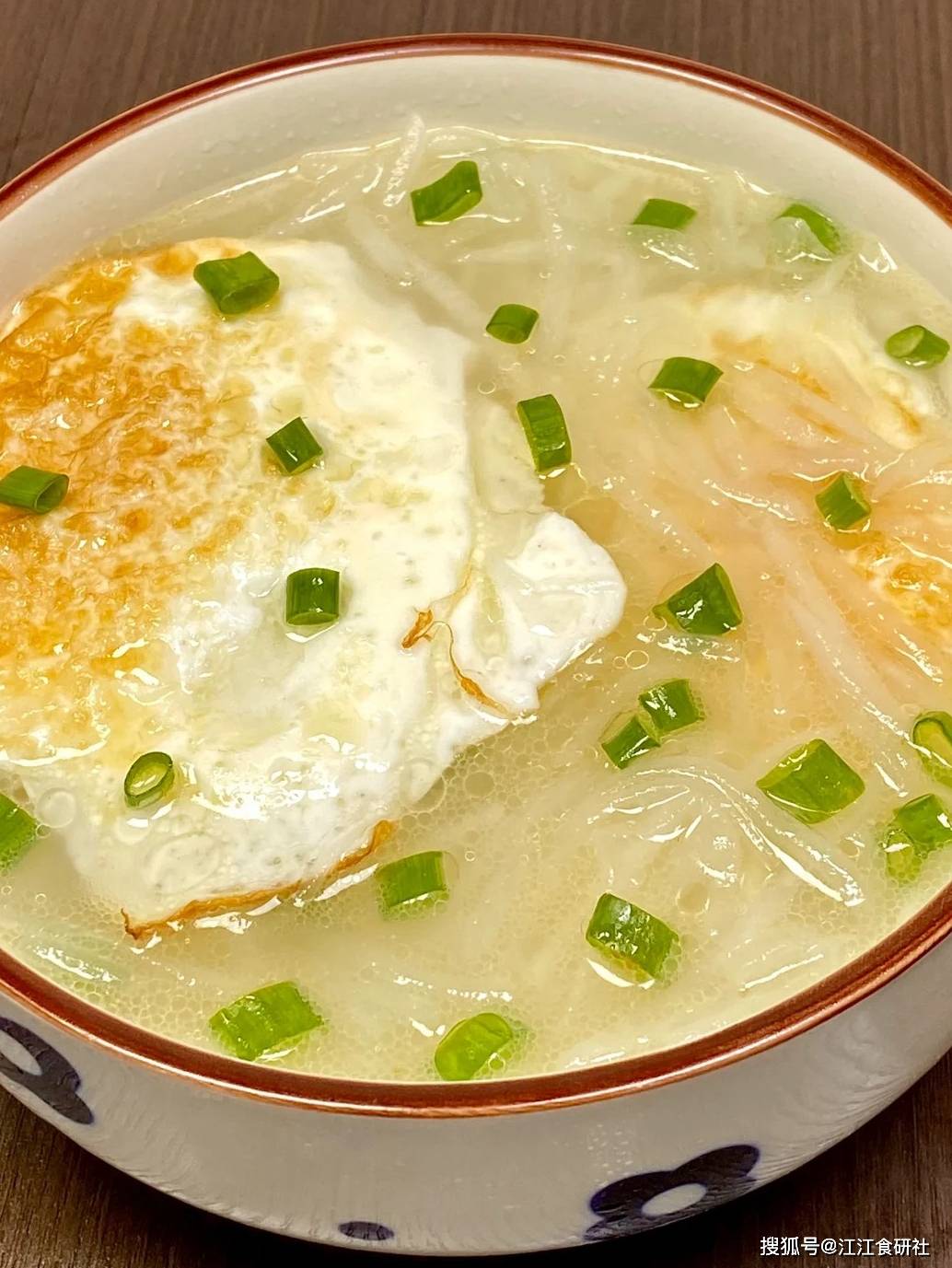 7. 出锅前撒上一把葱花,喜欢的话还可以点几滴香油,味道更香。这道汤的窍门有两个:一是鸡蛋要煎透;二是加水一定要加滚开的水,这样做出来的汤颜色好看,味道也足,萝卜丝软而不烂,老少皆宜。