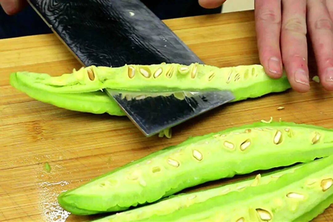 1. 处理苦瓜:将苦瓜洗净,竖切成两半,用勺子挖去中间的苦瓜瓤,确保瓤清除干净,这样苦瓜才不会太苦。然后将苦瓜切成薄片。