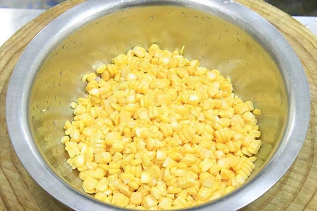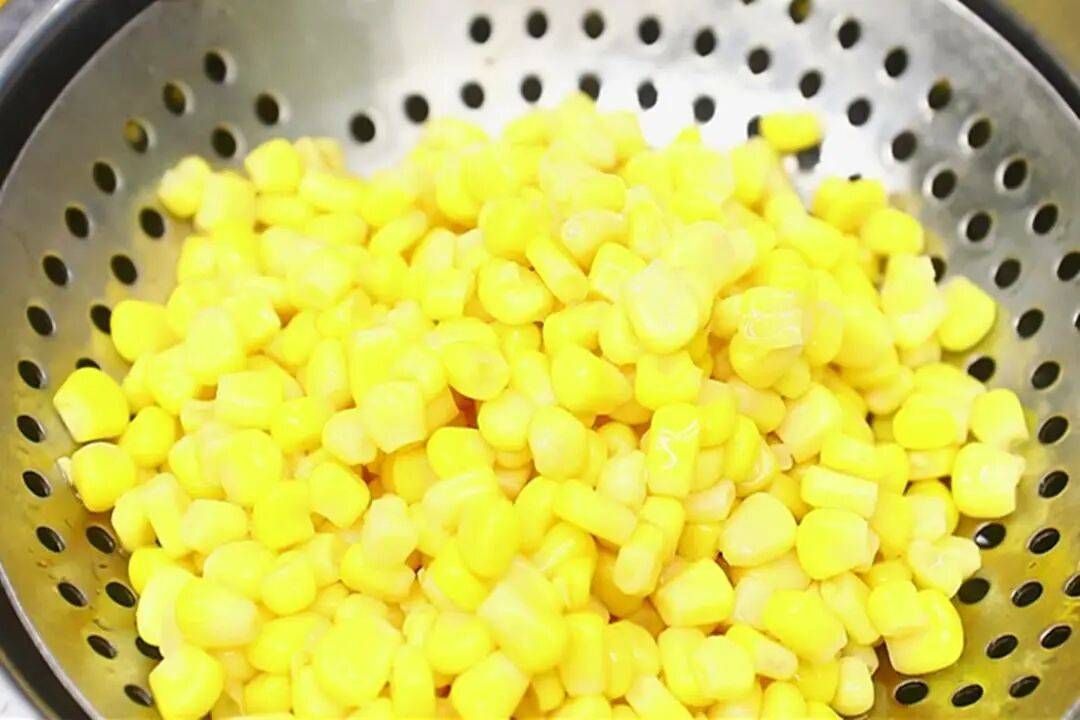 3. 焯水:锅中加入适量清水,放入少许盐和植物油,水烧开后倒入玉米粒和苦瓜片,焯水20秒后迅速捞出,用凉水冲洗过凉,控干水分备用。焯水时加入盐和油可以保持食材的色泽和口感。