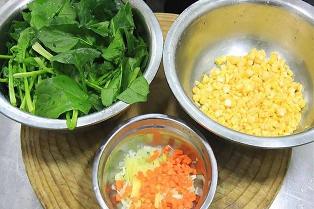 1. 处理食材:将嫩玉米的玉米粒切下来,清洗干净;菠菜择洗干净,去除烂叶泥沙;葱花、姜丝、胡萝卜粒切好备用。