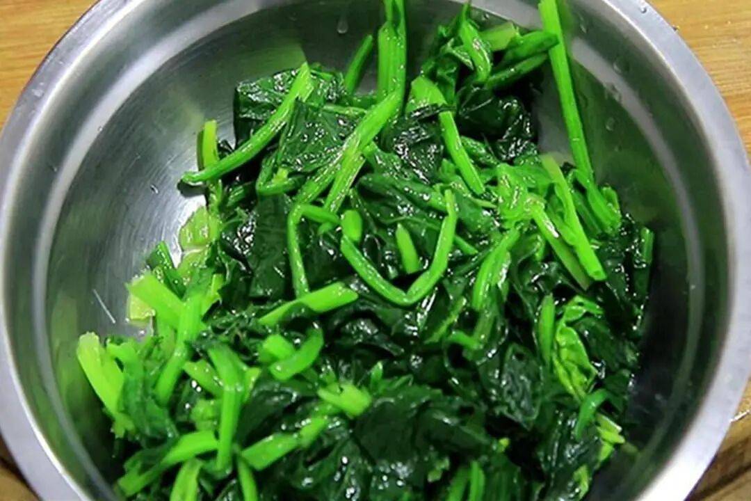 2. 菠菜焯水:锅内烧水,大火烧开后把菠菜倒入锅中,焯水20秒钟去除草酸,然后捞出用清水冲洗干净,控干水分后切成段。