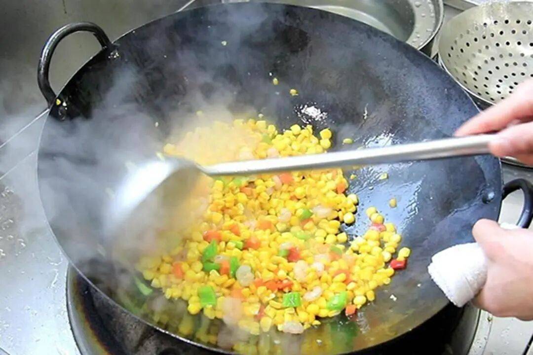 4. 调味:玉米炒香后,从锅边淋入少许清水,加入食盐、鸡精、胡椒粉,转大火翻炒均匀,使食材充分入味。最后淋入一点香油,翻匀后即可装盘。