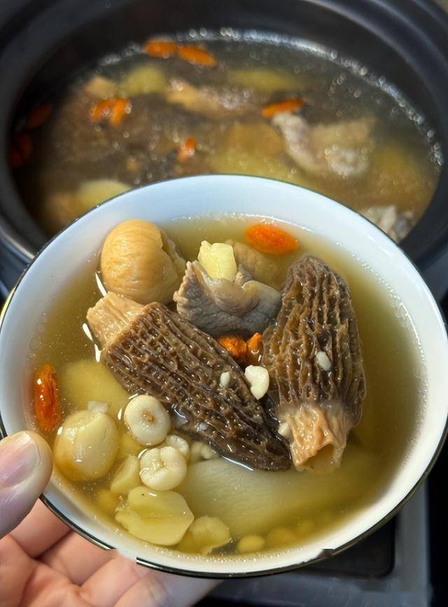 6. 40分钟后,放入羊肚菌,继续小火炖煮30分钟。