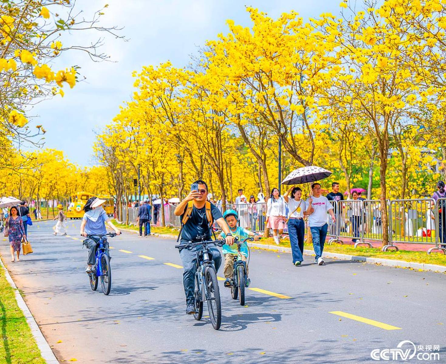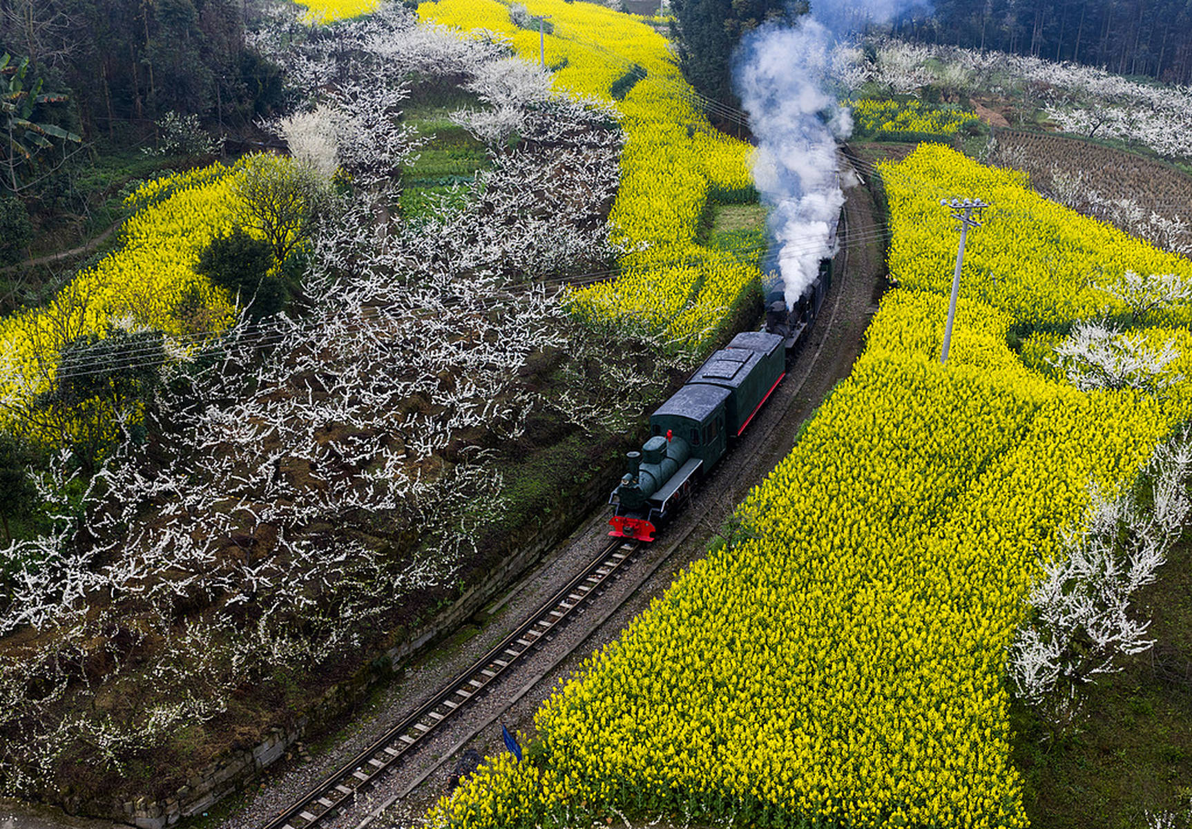 在南宁的白塔公园,杏花、玉兰与铁轨旁的绿皮小火车相映成趣,微风拂过,花香四溢,市民游客纷纷前来打卡拍照,尽享文艺浪漫。