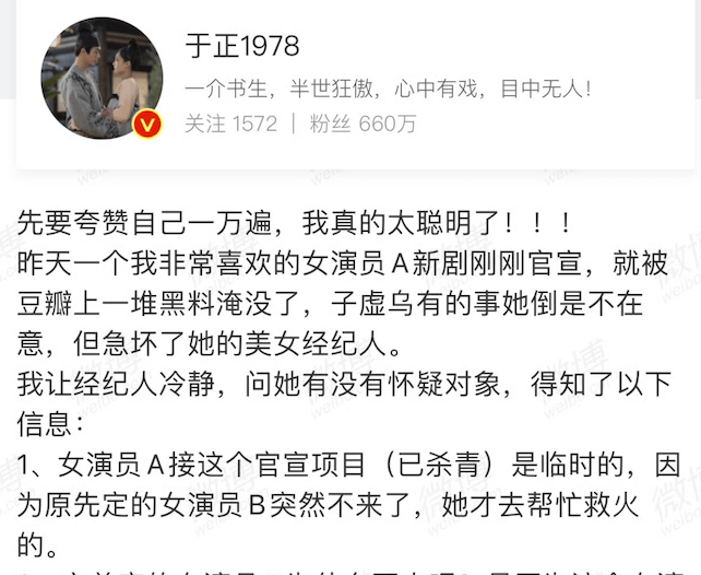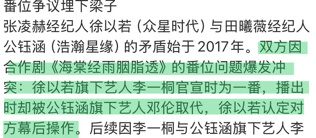 张凌赫和小田还被网友称为“仇二代”,这背后有着复杂的经纪人渊源。2017年疑似“争番”结下梁子,后面另一部《了不起的女孩》矛盾升级,官宣李一桐(张凌赫经纪人带)和金晨后,于正爆料这部剧经历了换角风波,有网友解读于正小作文里的A是李一桐,B是李沁(小田经纪人带),还有网传的小田经纪人朋友圈,让两人的关系更加微妙。
