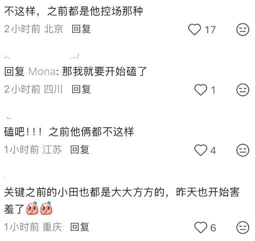 但正是这种在“仇二代”定义框架之外的暗流涌动,游离于秩序之外的情愫,为“田作之赫”增添了一丝独特的韵味。从最初的避嫌到如今的甜蜜互动,他们的关系发生了巨大的转变,这种转变让粉丝们更加着迷。