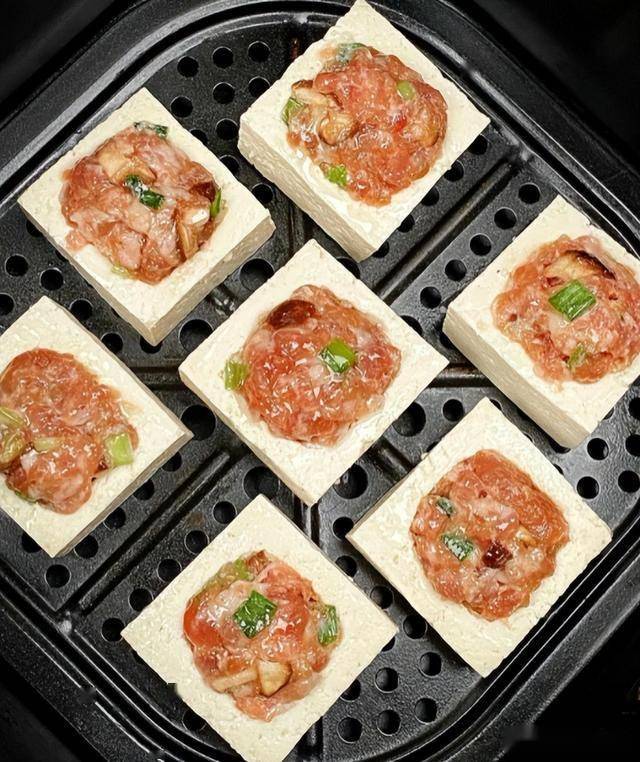 1. 北豆腐切成大小均匀的方块,用勺子在中间挖出一个小洞,注意不要挖穿底部。