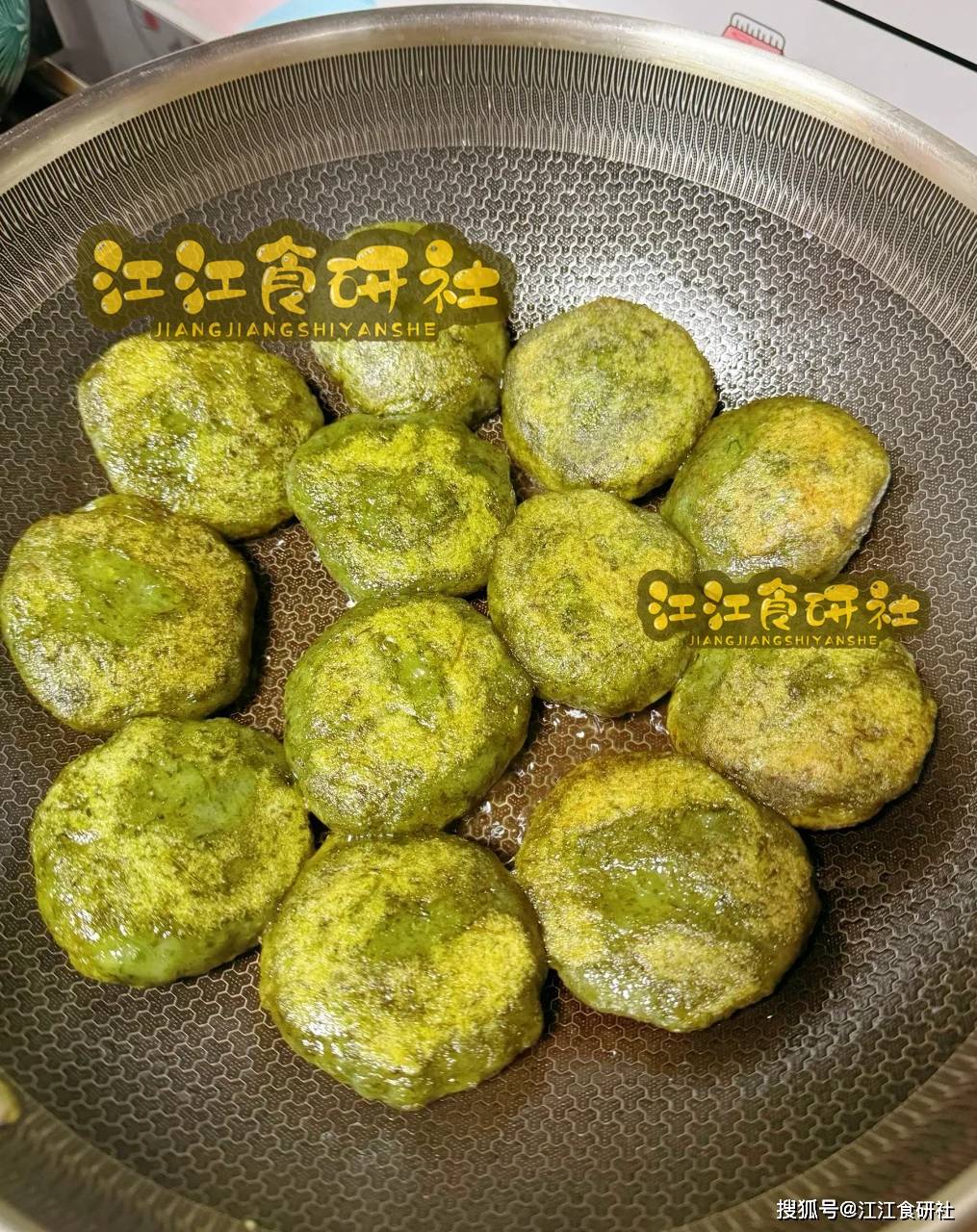 5、把控火候: 耐心煎到底面定型、呈现金黄色泽,并能闻到明显的艾叶和蛋香时,用锅铲小心翻面。继续煎另一面,同样煎至金黄酥脆。