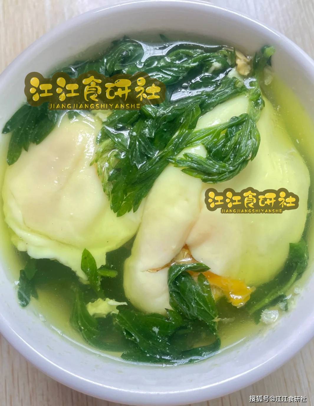 5、出锅享用: 待糖融化,艾叶香气融入汤中,即可关火。将荷包蛋和汤一起盛入碗中。