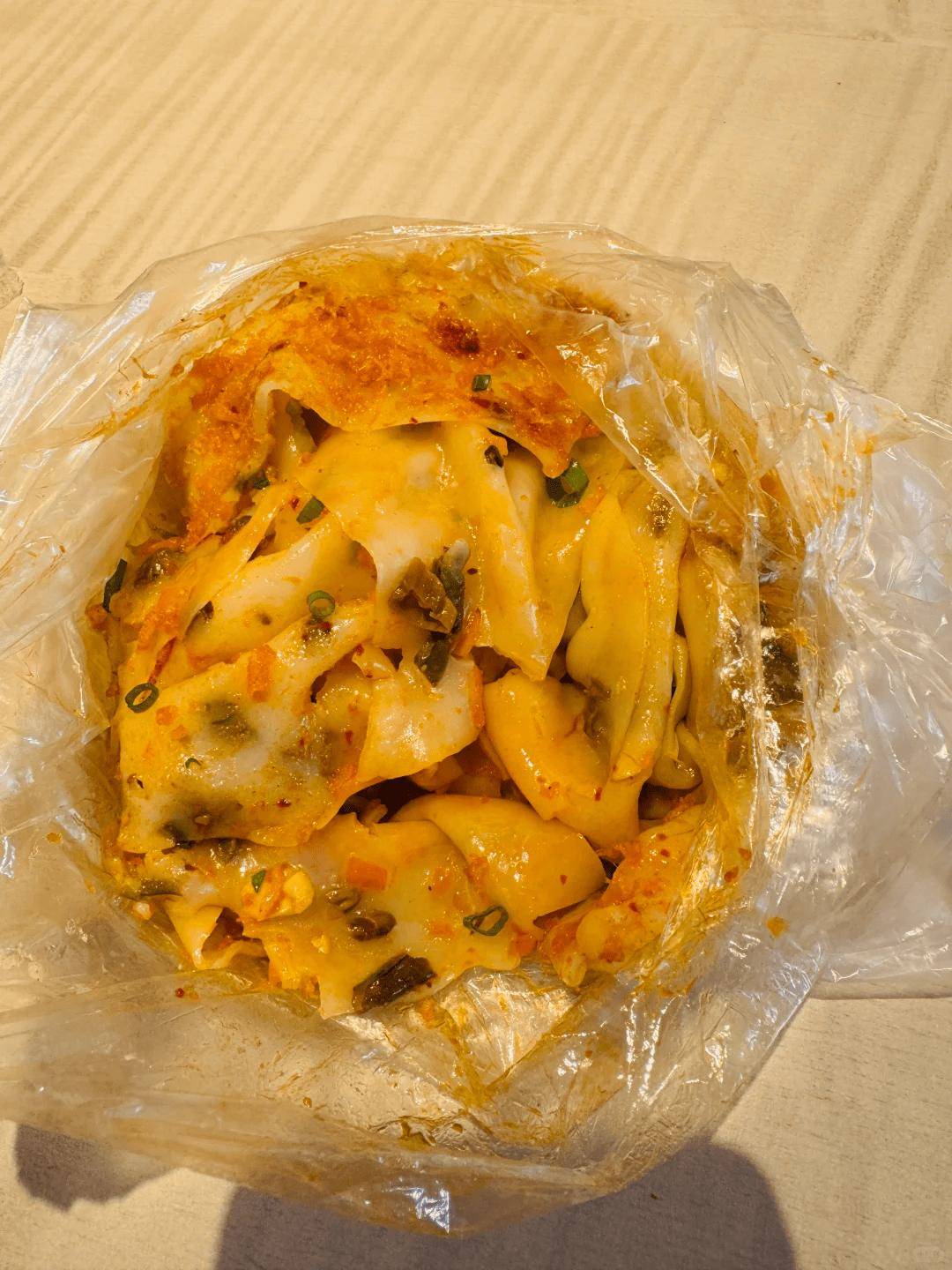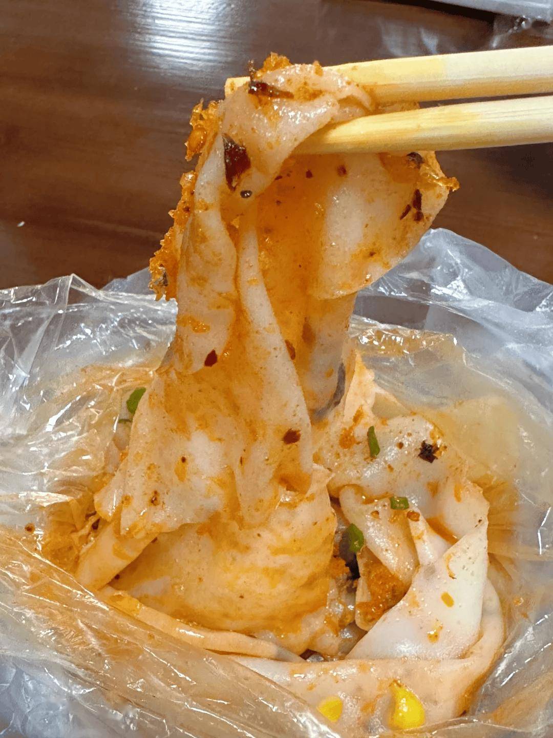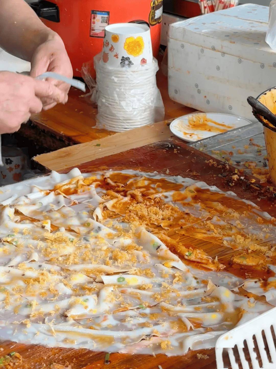 蒸汽糕是婺源早餐界的“白月光”,看似朴素,却能让人记一辈子。它是用大米浆发酵后铺在蒸屉上蒸熟的,切成方块的糕体布满了细密的小孔,口感比发糕更湿润,比海绵蛋糕更轻盈。糕面上铺满了厚厚的馅料——干笋丝、香菇丁、虾米,最后淋上一层秘制的辣椒油,米香与豆豉、辣椒的咸鲜交织在一起,即便已经吃撑了,看到街边刚出锅冒着白气的蒸屉,还是忍不住要买两块。