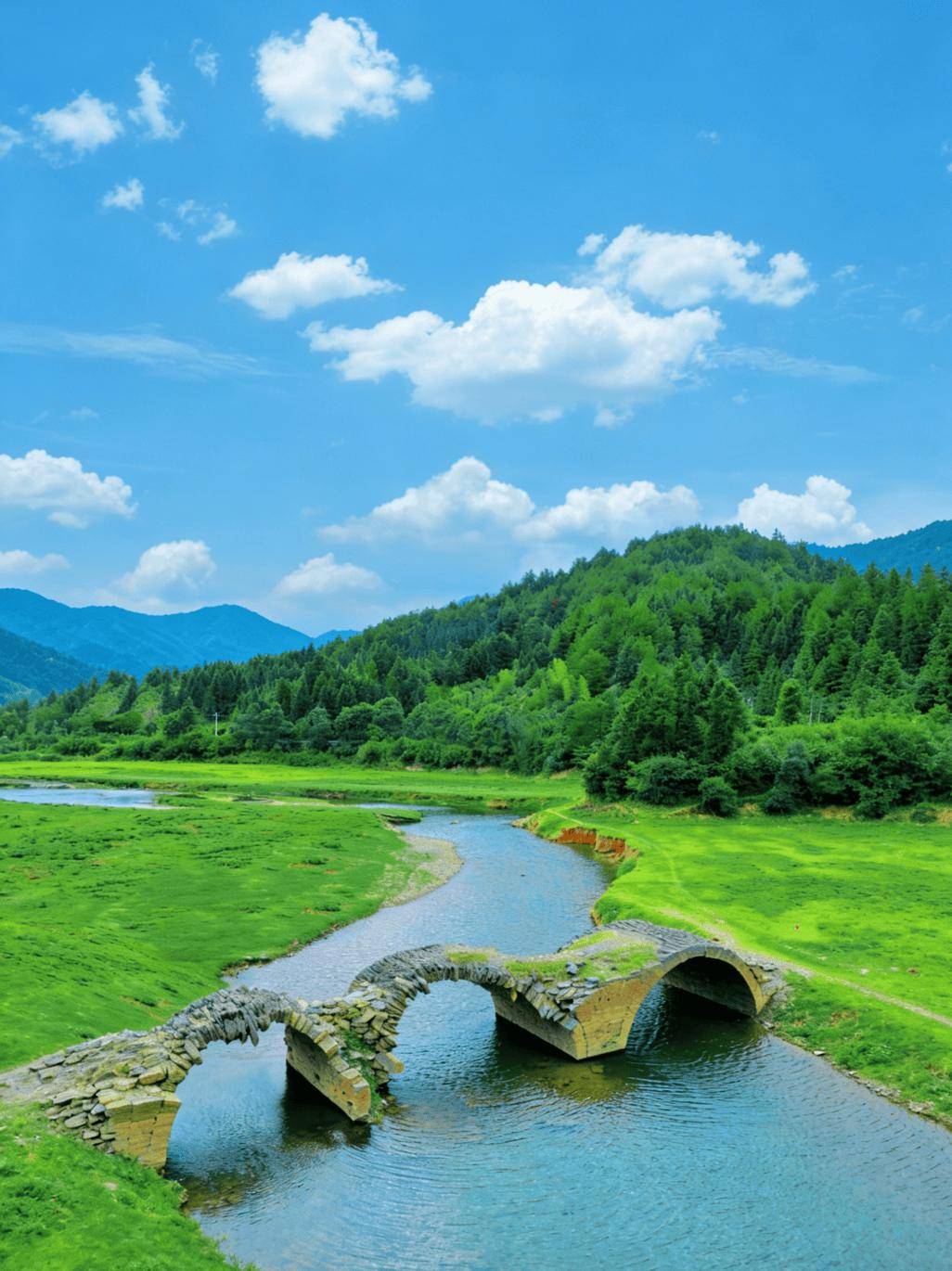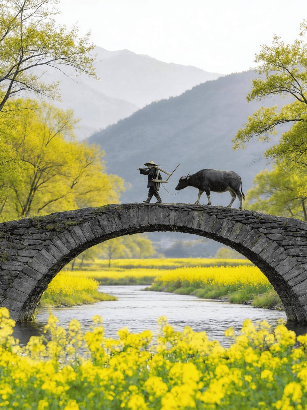 察关古桥建于宋代,是一座单孔石拱桥。历经千年的风雨,桥身被青苔和蕨类植物覆盖,苍翠得像是一块巨大的翡翠。春天里,桥头两侧漫山遍野的油菜花开得热烈,与古桥极其深沉的黛青形成对比。清晨,一位穿着蓑衣的老农牵着老牛从桥上走过,牛蹄敲击石板的声音清脆回响,这是婺源流传了千年的生活日常。
