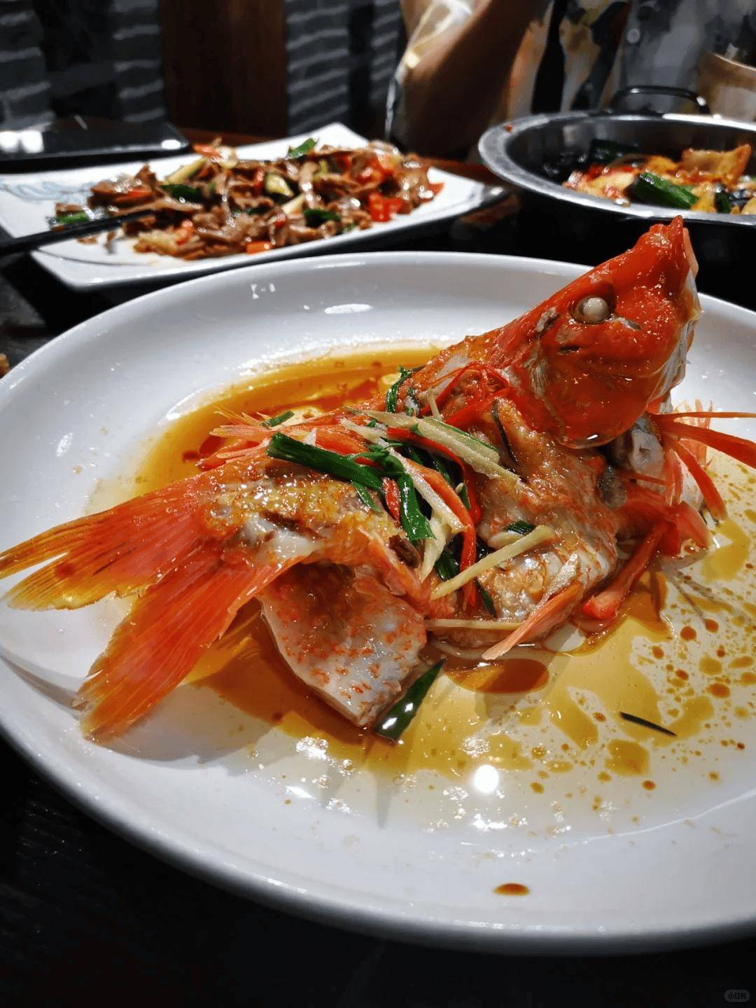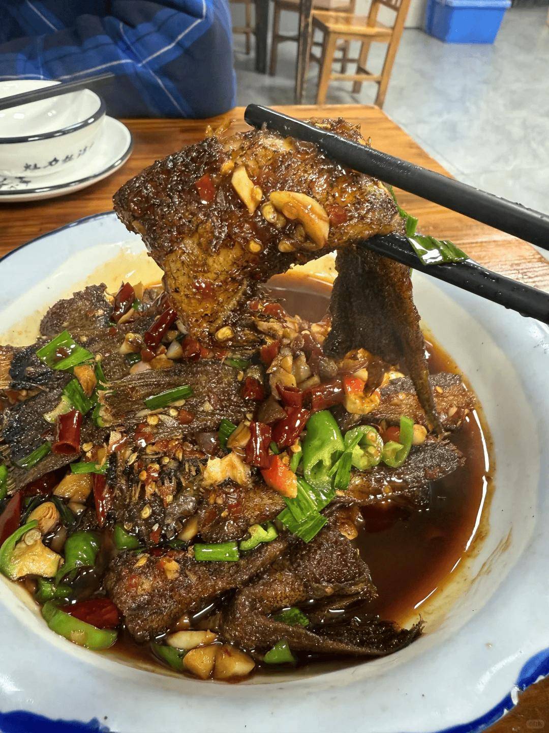 在婺源,荷包红鲤鱼是鱼中的佼佼者。鱼皮红得像火,像极了徽州人家的喜庆红灯笼。肉质极其细腻,肥美而不油腻,刺少肉厚,入口竟有一种淡淡的奶香味。最地道的做法是红烧,酱汁浓郁,鱼肉吸饱了汤头,每一筷子下去都是滑溜溜的鲜甜,是那种带着家常温度、能让人多干三碗米饭的“压轴大菜”。