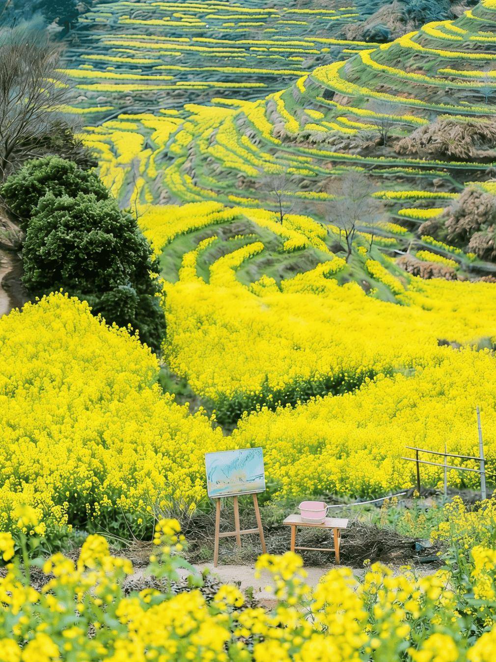 三月的婺源,是油菜花的海洋。万亩梯田油菜花从山脚盘绕至山顶,层层叠叠,如金色的瀑布般倾泻入谷,那气势磅礴的景象,让人惊叹不已。江岭,作为“中国四大花海之一”,更是将这种壮美展现得淋漓尽致。清晨五点,当第一缕阳光穿透远山的薄雾,整片山谷瞬间被染成金橙色,白墙黑瓦的徽派古村落散落其中,若隐若现,宛如一幅绝美的山水画卷。