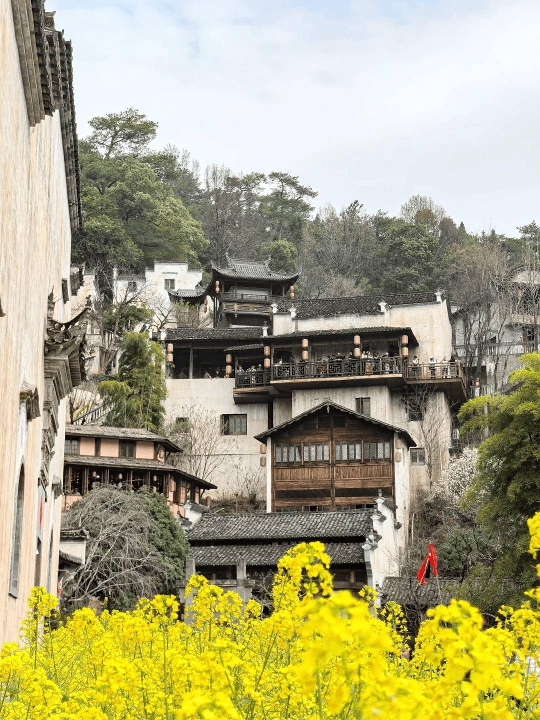篁岭则在三月初摇身一变,成为云端花海古村。这里的古村有着五百多年历史,倔强而优雅地“挂”在百米落差的山崖之上。漫步在天街,脚下是错落有致的青石板路,身边是盛开的梨花、桃花与杜鹃,推窗即见景,出门已入画。站在高处的露台上俯瞰,梯田花海在深邃的山谷中延展,马头墙的挺拔线条与之相互映衬,构成了一幅“天人合一”的建筑美学画卷。