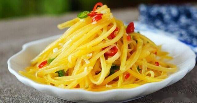 2、起锅烧水,水开后加入1勺白醋,放入红薯丝,焯水20秒左右捞出,快速过凉水降温,沥干水分。