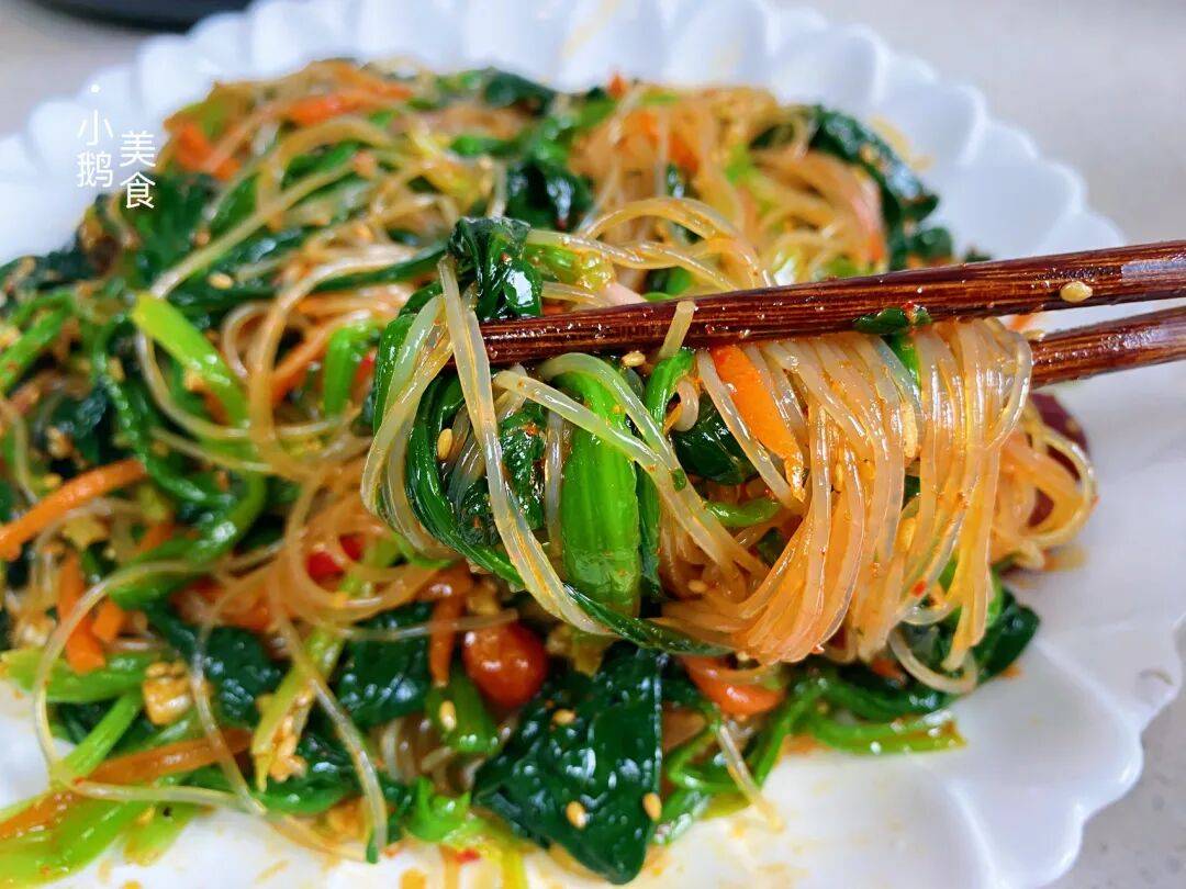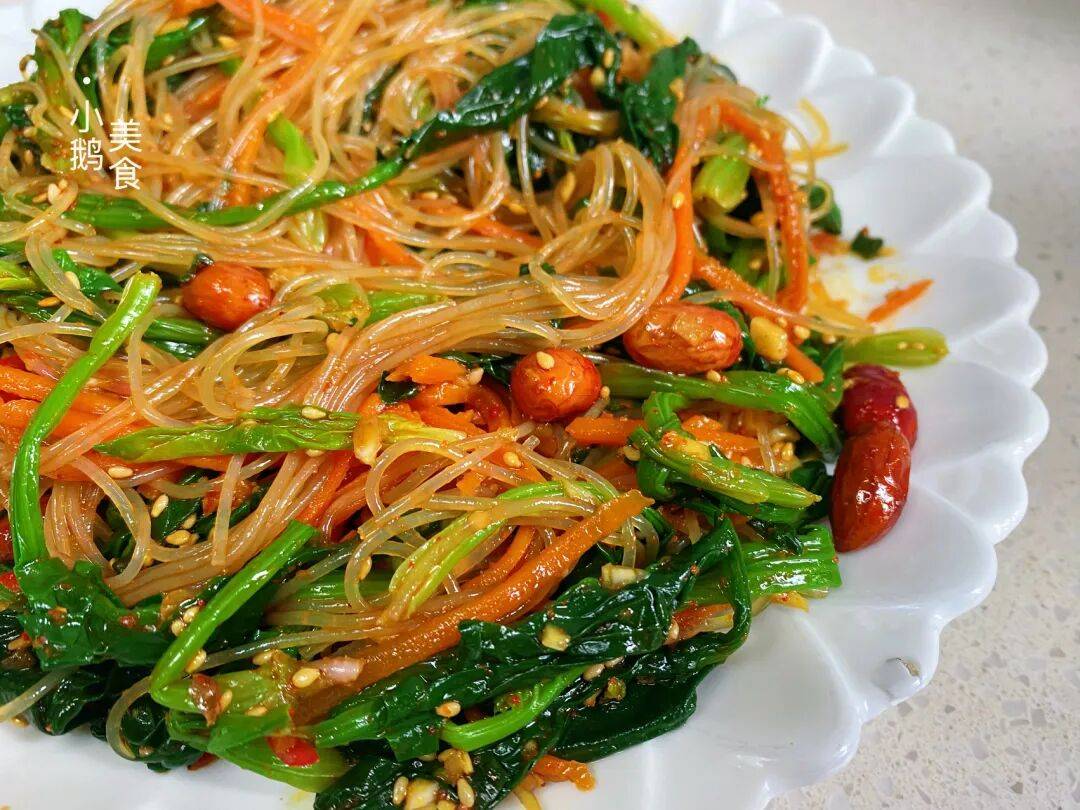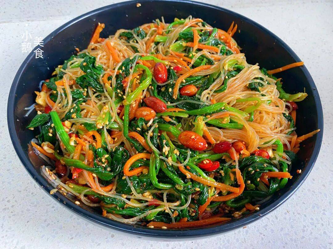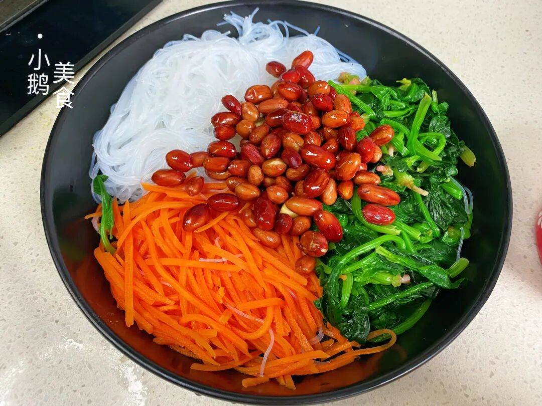 这样做的凉拌菠菜,一口下去,花生的脆、粉丝的滑、菠菜的嫩、胡萝卜的甜,四种口感在嘴里碰撞,清爽开胃不油腻,吃起来真的超过瘾。