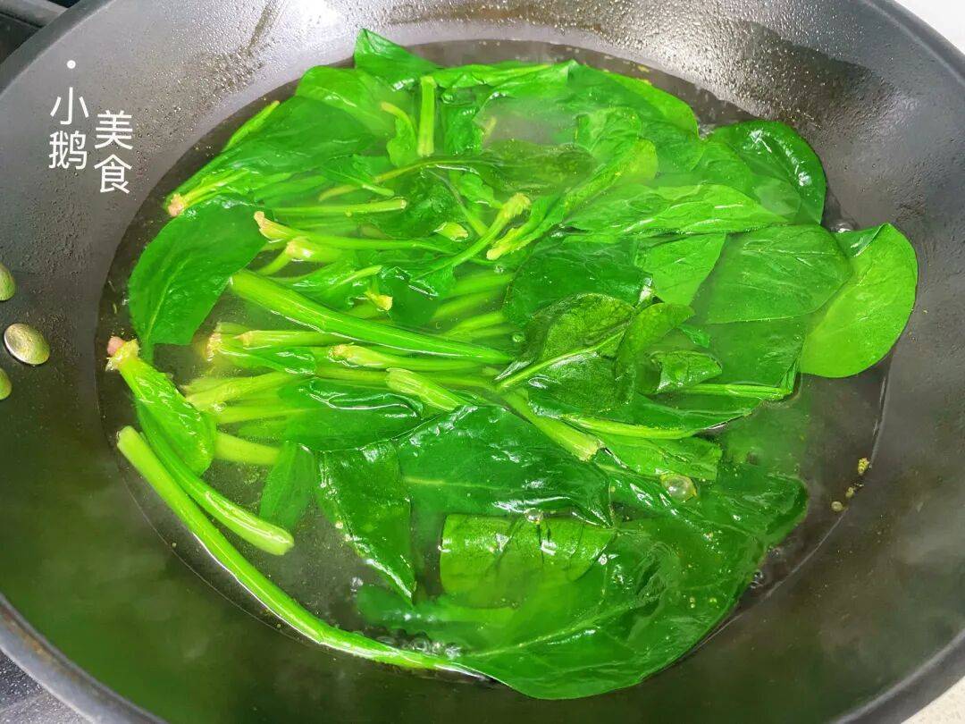 4,菠菜草酸比较重,建议最后再焯水,避免草酸沾到别的菜里。烫30秒左右,看到变软变色,就捞出来立刻过凉水,这样颜色翠绿,口感也更爽脆。