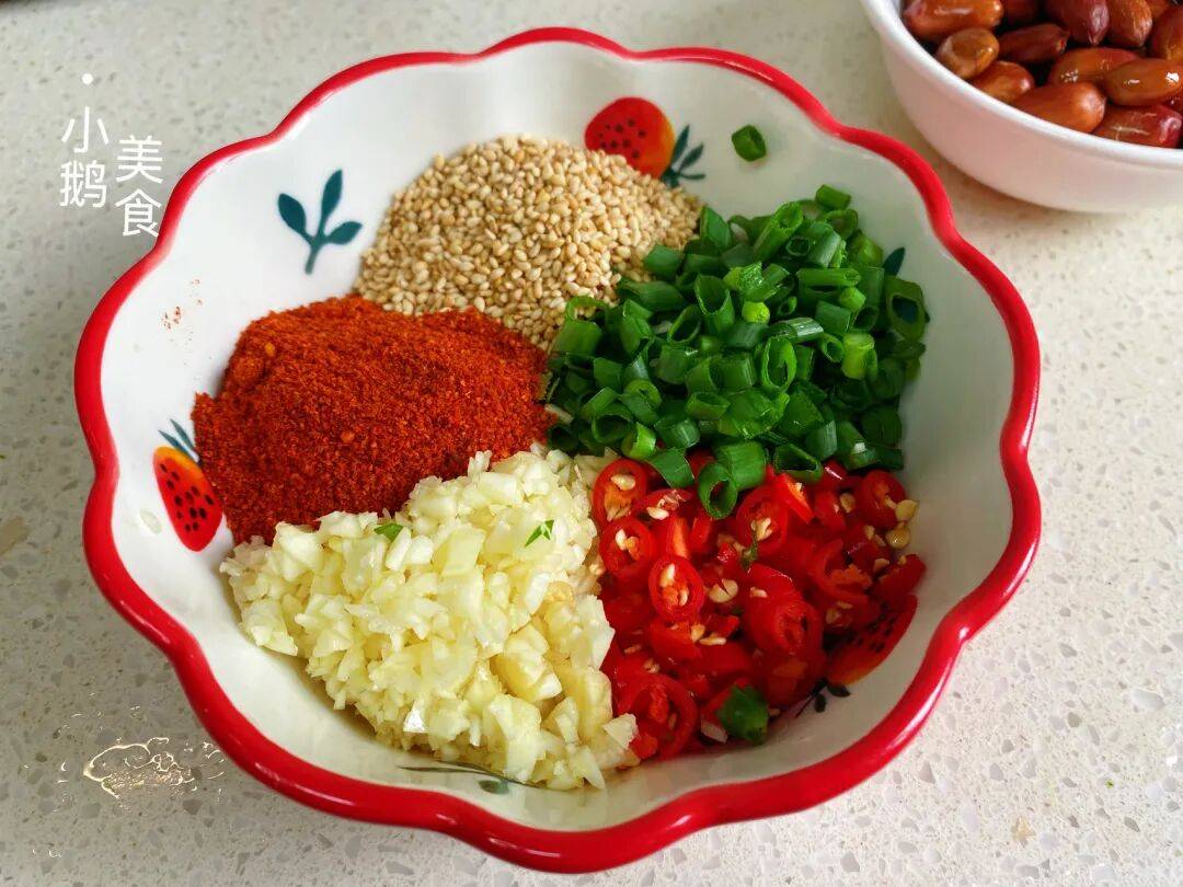 6,调灵魂料汁。碗中放入葱花、蒜末、小米椒、辣椒粉、熟芝麻,再把炸花生的热油,直接浇在料头上,“滋啦”一声,香味瞬间迸发。