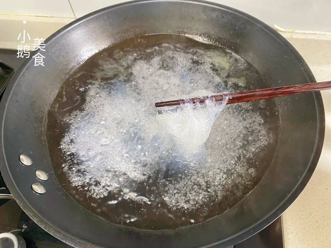 5,炸花生米。花生洗净擦干水分,锅里稍微多放一点油,后面还有用。记住一定要冷油下锅,小火慢慢炸,全程不停翻动。看到花生颜色微微变深,就立刻关火,利用余温继续加热,多等一秒就容易发苦。炸好放凉,就是嘎嘣脆的。