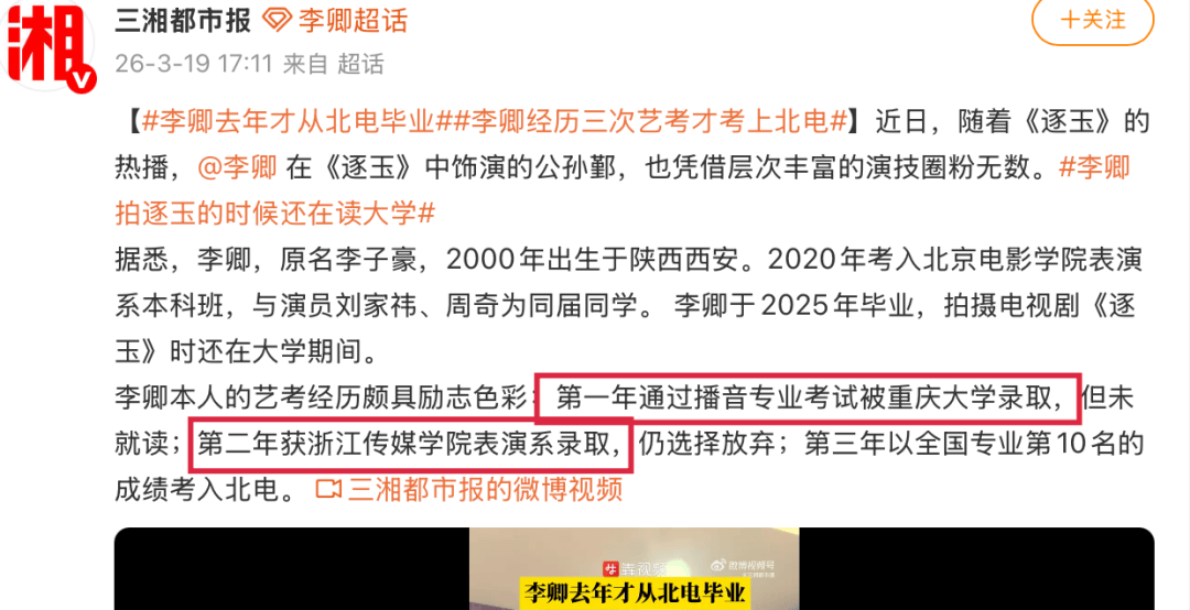 李卿是00后学霸,毕业于北京电影学院,以专业第十的成绩入学,和周奇、刘梦芮是同学。这组毕业照充满“体制内”既视感,女生刘梦芮在《莲花楼》里饰演公主比较出圈。北电是李卿第三次艺考的结果,前两年他分别被重庆大学播音系和浙传表演系录取,但他放弃这两所优质院校,可见对表演的尊重与热爱。