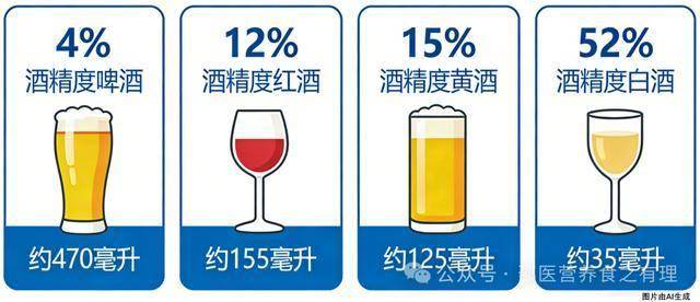 换算公式:饮酒量(ml)×酒精浓度(%)× 0.8(酒精密度g/ml)=酒精摄入量(g)