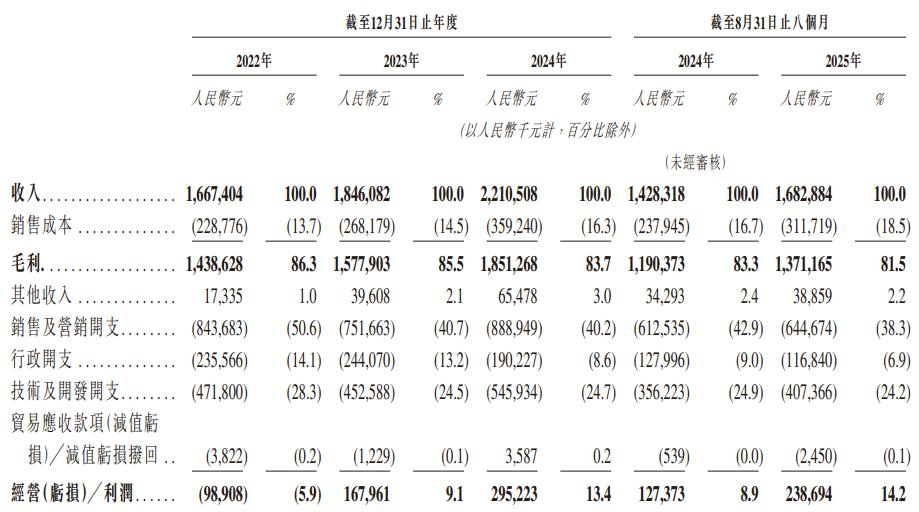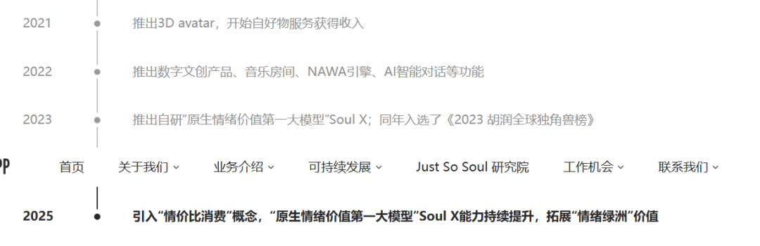图片来源:Soul招股书 从具体财务表现来看,招股书显示,2022年至2024年,公司营收分别为16.67亿元、18.46亿元和22.11亿元,三年复合增长率超15%。更关键的是,Soul已实现从长期亏损到稳定盈利的转折,2023年盈利为3.61亿元,2024年盈利为3.37亿元,2025年前8个月已达2.86亿元。 不可否认的是,光鲜的数据,让Soul此次申请上市的底气更足了些。此外,Soul还请来不少资本为其背书,除了腾讯,米哈游、Genesis Capital、5Y Capital等都出现在了其招股书中。 可以说,为了上市,Soul使出浑身解数。毕竟,在此之前,Soul的上市路可谓屡战屡败。 早在2021年5月,Soul就曾向美国证券交易委员会(SEC)递表,拟在纳斯达克上市,随后的6月18日更新招股书确定发行区间,IPO募资2.28亿美元。但就在当月下旬,Soul突然宣布终止上市进程。 赴美IPO的计划落空,便转战港股。2022年6月30日和2023年3月27日,Soul曾两次通过在开曼群岛注册的Soulgate inc向港交所提交申请书。彼时,Soul表示,考虑到香港联交所与自身最重要市场——中国内地的连通性,赴港IPO将符合集团业务发展战略的利益。不过,2022年6月转战港交所时,受限于6个月的有效期,其招股书未能及时推进而失效。2023年4月,Soul更新财务数据后再度递表,却仍未如愿。 一波三折后,Soul如今再度冲刺上市,对自己的定位也早已迭代为“多元有趣的GenAI社交游乐园”。而这个“AI+”时代,对Soul而言,究竟是利是弊? 和AI聊天,需要“中间商”吗?值得一提的是,根据Soul的招股书,其间接成本中,研发费用占比最高,达28%。2025年前8个月,其研发投入达3.91亿元,主要用于SoulX模型的迭代与AI技术的创新。招股书披露,公司拥有AI相关研发人员420人,占总员工数的35%,核心研发团队成员多来自谷歌、腾讯等科技企业。持续的研发投入,是其AI技术壁垒的重要保障。 而在Soul的官网,AI含量也很高。从2023年起,Soul就提出了“AI+沉浸式社交”新范式。而如今,在其官网首页,其强调,Soul的“AI大模型”能随时随地提供“情绪价值”,让你和懂自己的人即时互动,或者和“超有活人感”的AI伙伴敞开心扉。 此外,在招股书中,AI也已跃升为核心关键词——依托自研的情绪价值大模型Soul X,搭配AI推荐系统、AIBooster等功能,提升用户匹配效率,降低社交门槛。 显然,Soul意识到,AI技术的进步已经势不可挡,而“AI+社交”则是Soul顺势而为的选择。