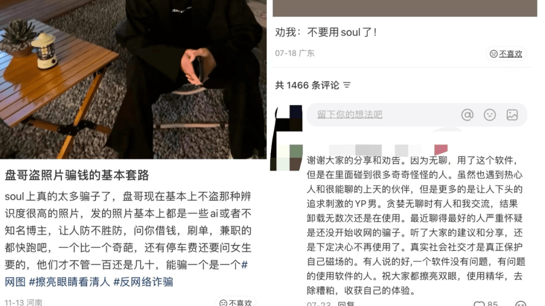 此后,在小红书、微博等平台上,也有不少网友提到自己在Soul上遇到了骗子。其中有网友发布笔记称,“soul上真的太多骗子了……一个比一个奇葩。” 此外,值得一提的是,虚拟物品消费是Soul最主要的收入来源,占比达68%。这些虚拟物品分为“社交礼仪类”与“情感表达类”,前者包括用于破冰的“灵魂探测器”“搭讪卡片”,后者则有表达亲密的“虚拟抱抱”“专属守护”等。价格从1元到1000元不等,其中定价10-50元的中端虚拟物品贡献了70%的虚拟物品收入。招股书披露,2025年前8个月,平台虚拟物品的月均交易次数达1.2亿次,较2024年增长25%。