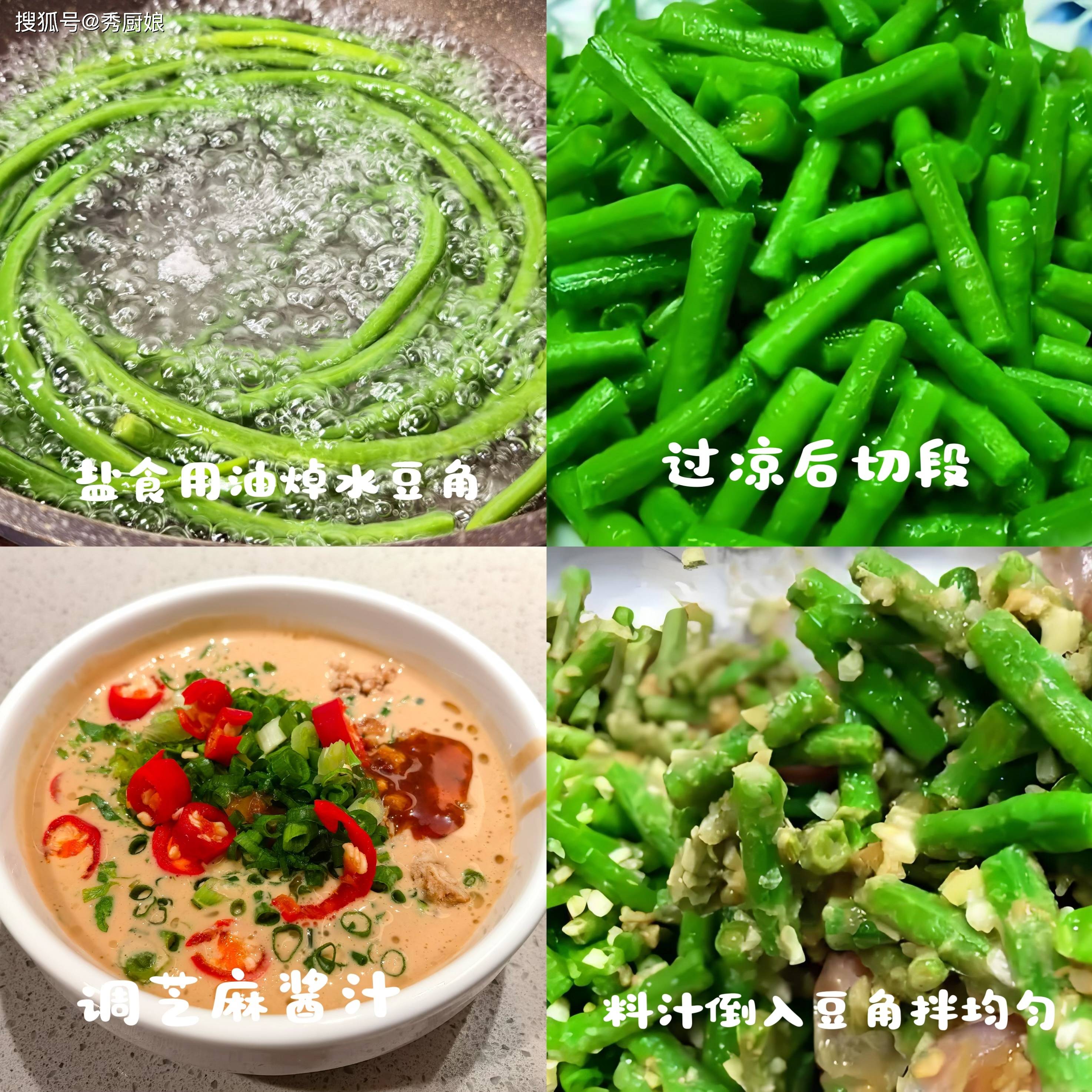 一、麻汁拌豆角:清爽开胃的补钙小凉菜 1. 豇豆洗净,切成长段。锅里水烧开,加少许盐和几滴油,放入豇豆焯熟(约3-5分钟),捞出过凉水,沥干摆盘。 2. 调麻汁:两勺芝麻酱加少许温水慢慢泄开,加入一勺生抽、半勺香醋、少许盐和糖、蒜末,搅匀成顺滑酱汁。
