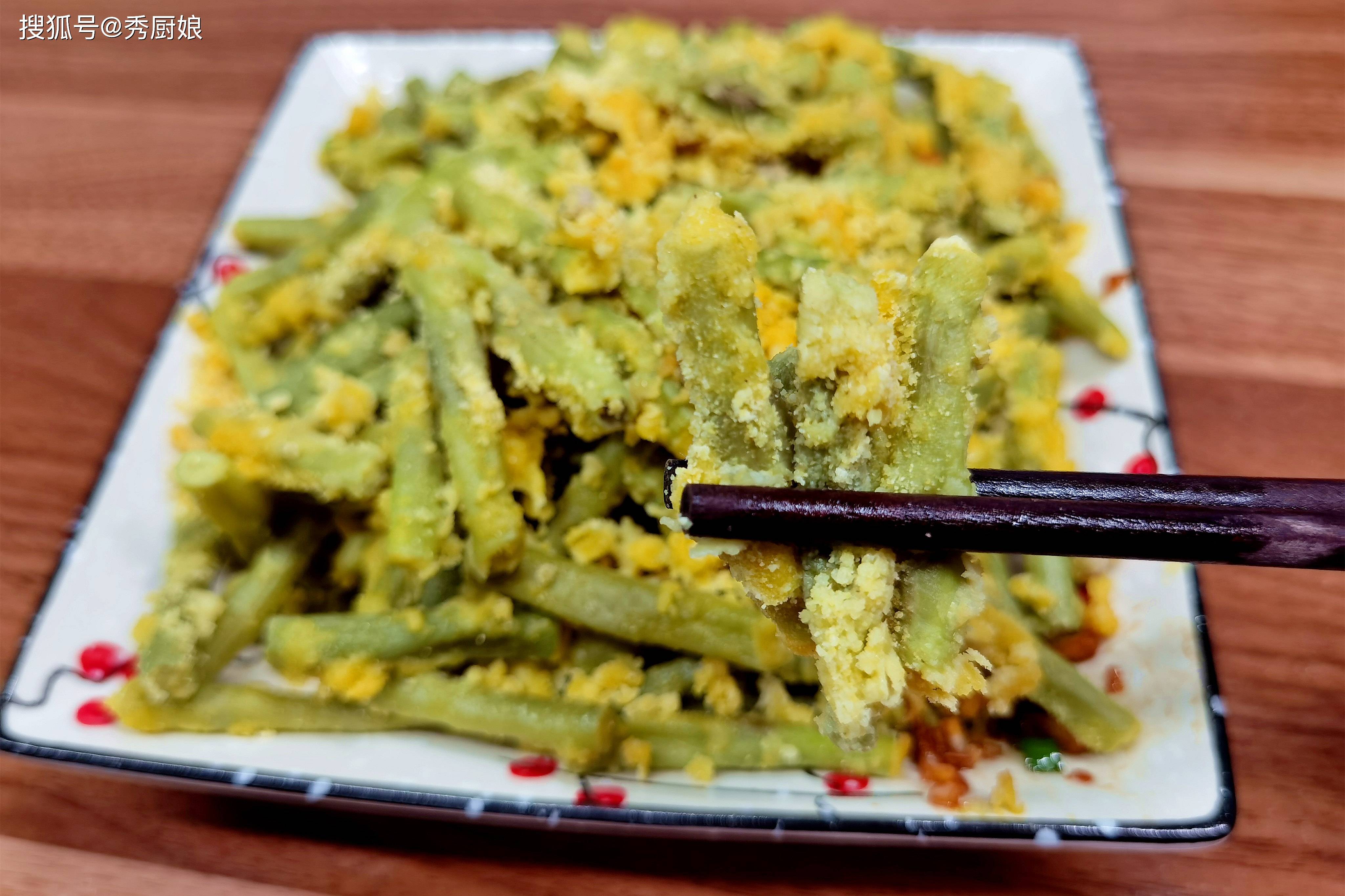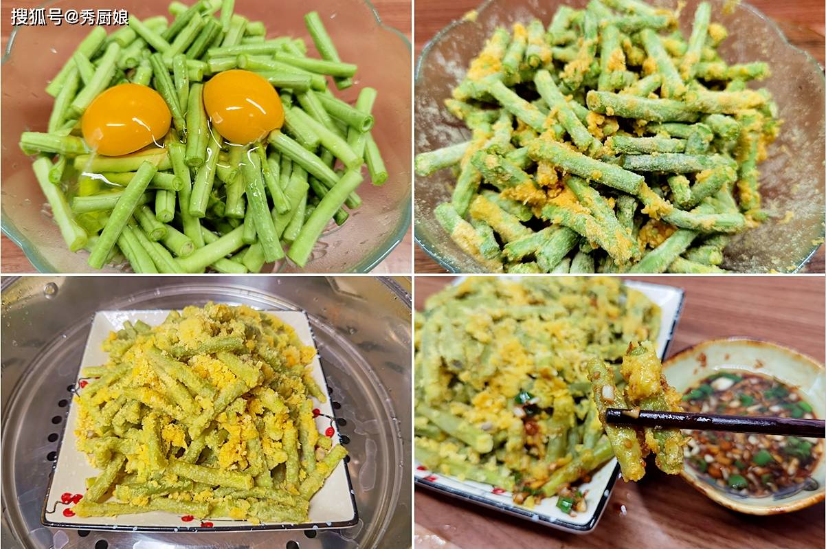 3. 蒸屉铺上湿笼布或刷薄油,将拌好的豆角均匀铺开,水开后上锅,中大火蒸10-12分钟即可。 4. 出锅后可以直接吃,也可以调个蒜泥醋汁蘸着吃,风味更足。 这是道非常健康的“主食菜”。玉米面是优质粗粮,和豇豆、鸡蛋搭配,蛋白质、钙质、膳食纤维一次补齐。蒸的做法不上火,原汁原味,口感扎实饱腹,特别适合需要控制体重又想补钙的中老年朋友和宝妈们。