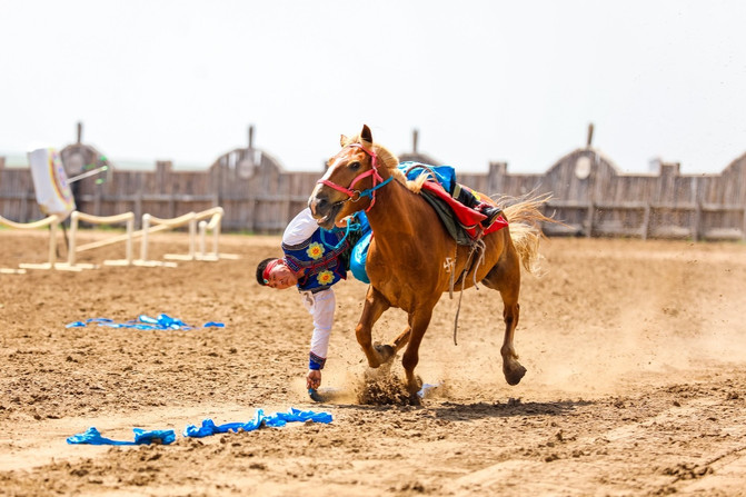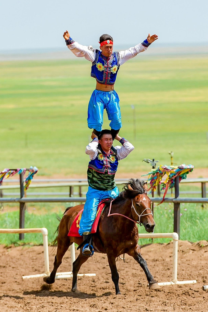 蒙古人骑马方式很多种,这些特技表演吸引台前阵阵掌声。马后藏人,这个应用于战争时期,人以马为掩体,出其不备,一招制敌。