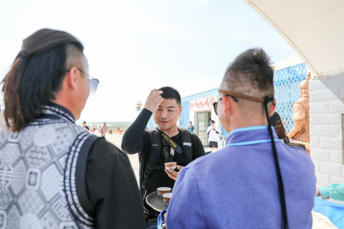 每一个来过草原的人都要接受蒙古族最隆重的接待礼仪——下马酒。以示草原人民的热情。蒙古人给客人敬酒时,我们要用双手接过银碗,并向主人致谢,然后一只手瑞着银碗,用另一只手的无名指轻轻的点沾银碗中的酒,向不同方向弹三下,表示敬天、敬地、敬祖先。