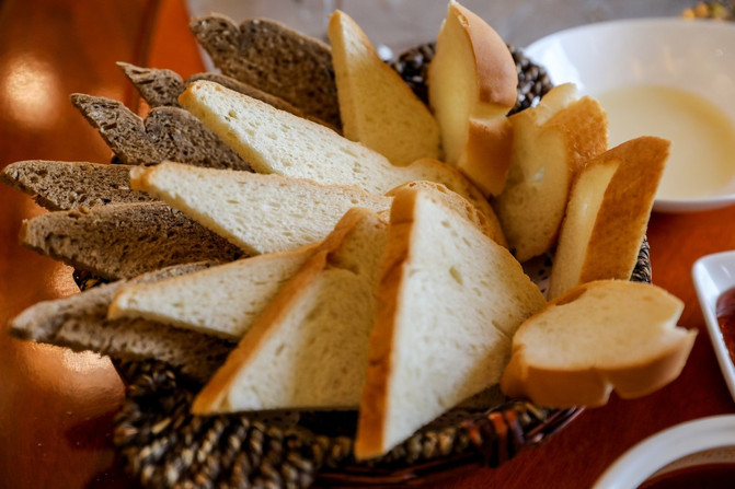 在满洲里套娃酒店品尝了特色的俄餐,味道也是炒鸡棒的。现烤俄罗斯大列巴,新鲜热乎的,从口感上来说类似全麦面包。然而俄罗斯主厨去掉了糖分,却提供了新鲜的奶油和番茄酱做为蘸料,加之又是热乎乎的,让这本来平淡无奇的面包,顿时变得不一样了。