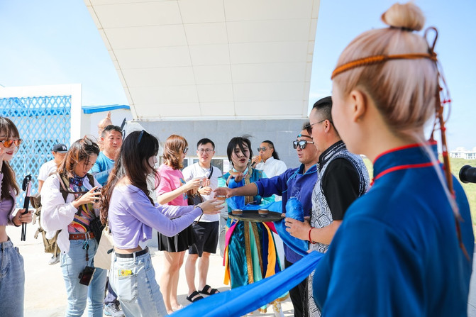 我们乘车来到巴尔虎部落门口,已经有马队迎接我们的到来,我们一行车队跟着马队来到景区门口,先来下马酒。