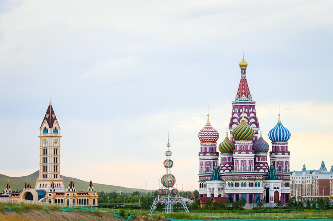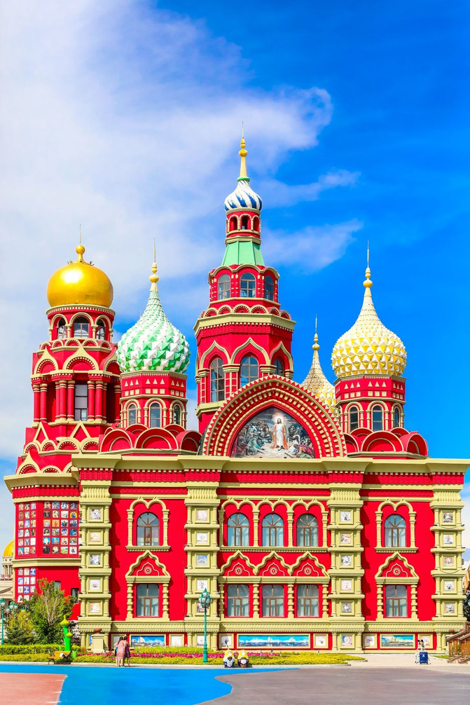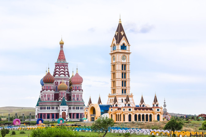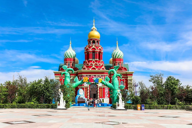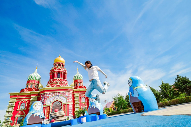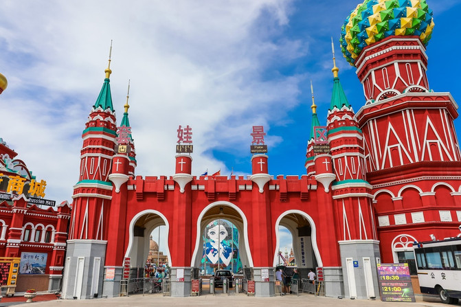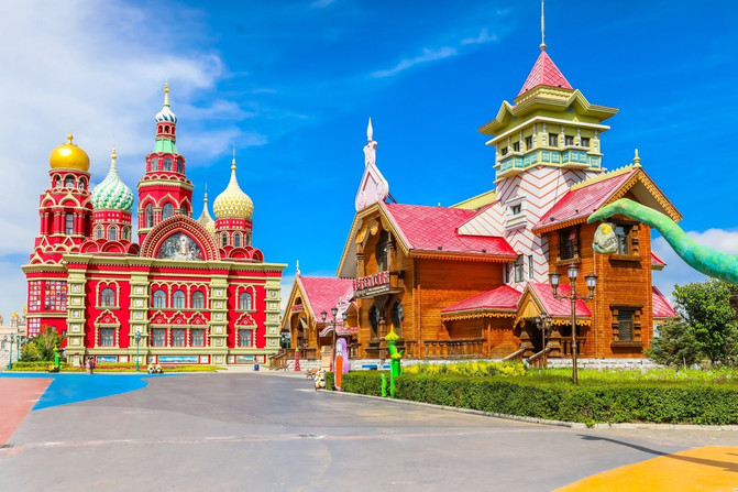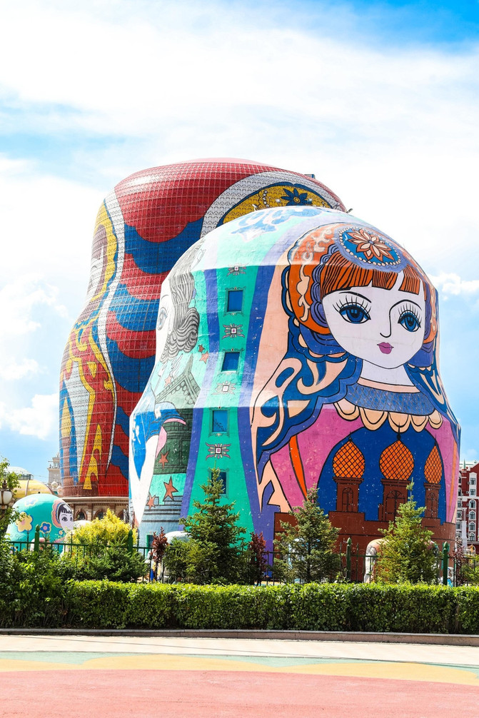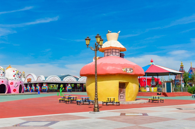 吃过午餐,我们直接进入套娃景区,这个地方,如果带我家小姑娘来,她一定很高兴。一水的像童话一样的建筑,门口以莫斯科红场为建筑元素的入口,进到里面各种各样的套娃,各种俄罗斯民俗体验馆,各种手工艺品直营店,还有各种大大小小的游乐设施,各种色彩艳丽的布置,这里,约等于一个小型的迪士尼。
