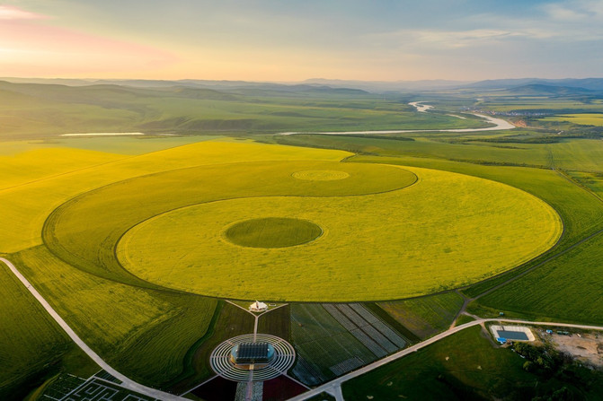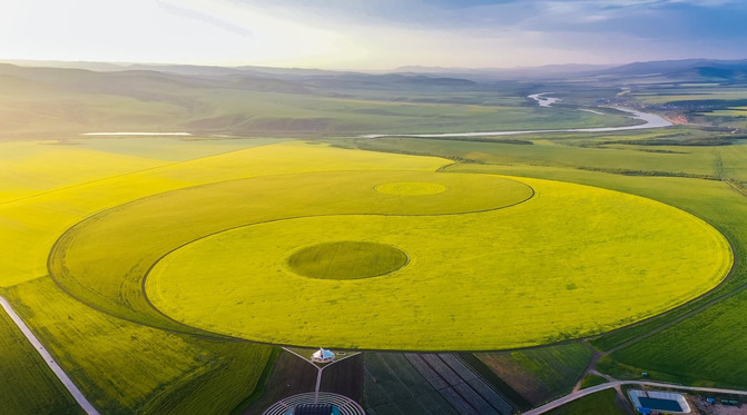 奥洛契庄园内拥有世界最大小麦和油菜种植而成的直径1300米,外圆4082米,面积1989亩农作物人工太极图。因占地面积太大,只有借助无人机高空可看清全景。
