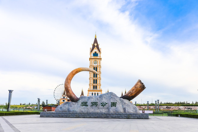 【猛犸公园—感悟猛犸文化】 走在草原公路上,位于内蒙古呼伦贝尔市扎赉诺尔新区的猛犸公园出现在距离满洲里不远的公路旁。草原上拔地而起的摩天轮绝对是这里的奇特建筑,而除了摩天轮,更让人惊叹的是被称为猛犸象故乡的猛犸天堂。
