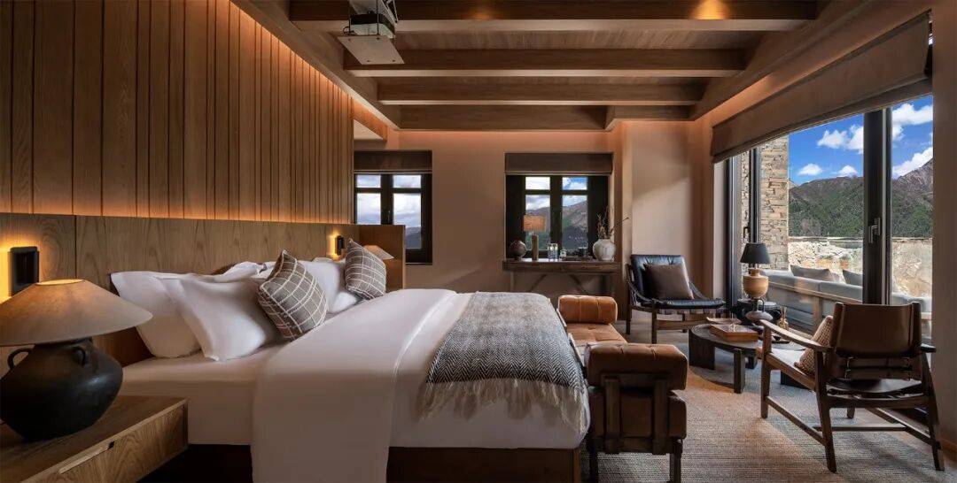 民宿客房室内(摄影:成都天堂鸟视觉摄影有限公司) 除了经济发展的考量,规划设计充分尊重和保护亚丁村半农半牧的生产结构,延续祈福、织布、劈柴、煨桑、转经、锅庄等生活场景。曾经无序生长的亚丁村,重新恢复为美丽的藏乡,成为香格里拉旅游大环线上新的人文目的地。