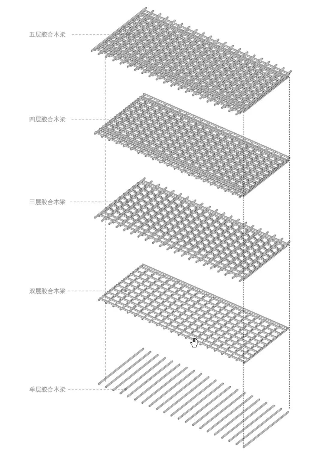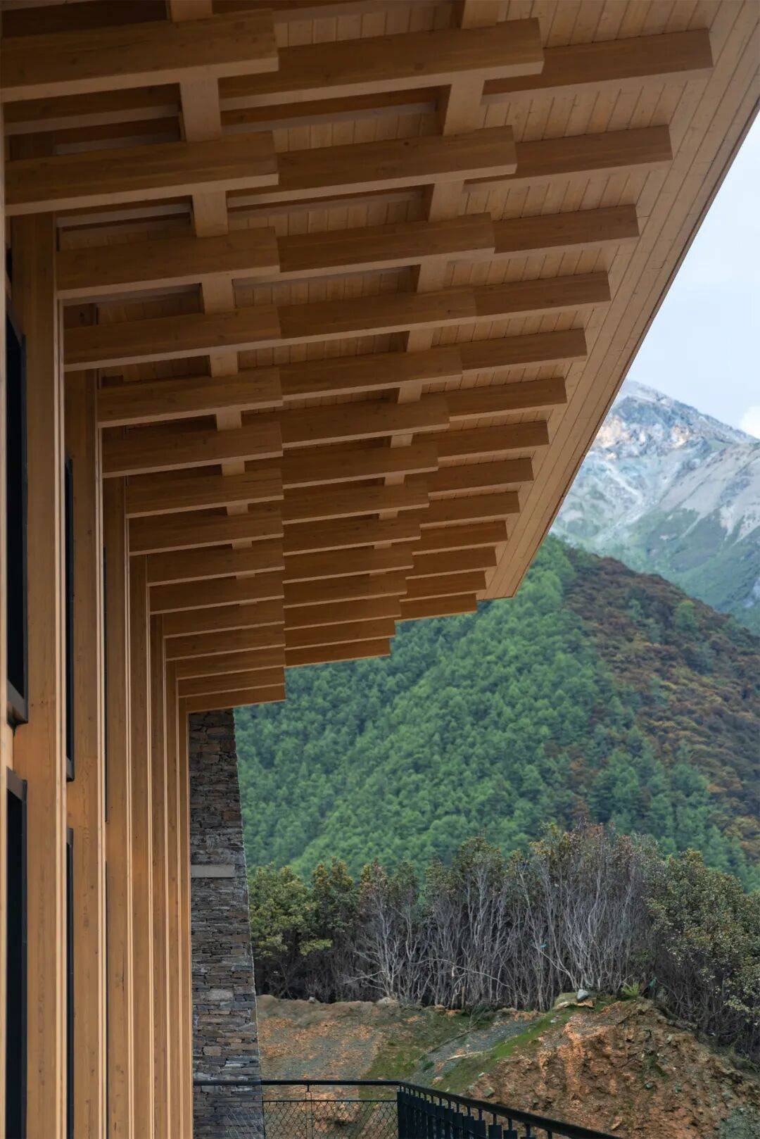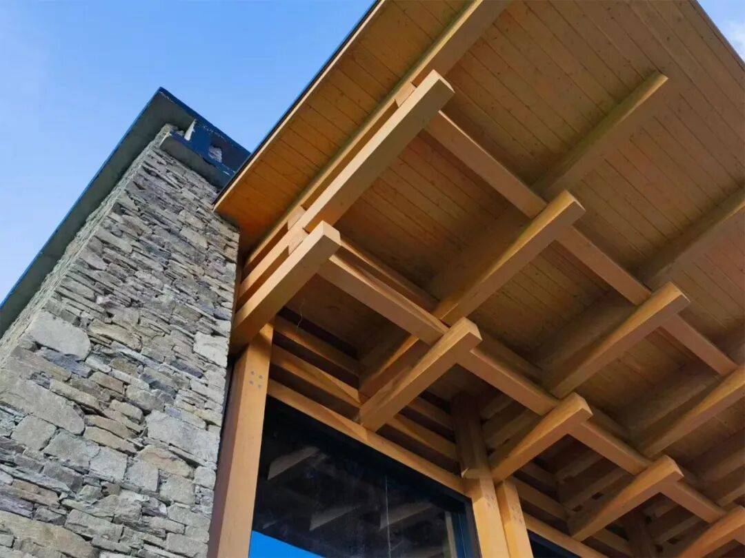 蓝月山谷(摄影:刘艺) 为了减少12米单跨的木梁截面,特别设计了一种层叠梁架,用小截面的胶合木方纵横叠压,形成一个空间结构体系,光线弥漫在木方的间隙,进一步减弱了结构的视觉重量。屋盖的出檐以木方逐层出挑,与藏式传统门窗的梁头做法异曲同工,以构造回应藏地文脉。