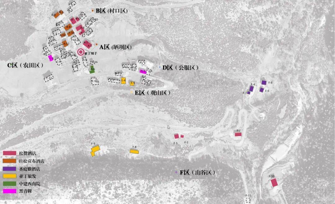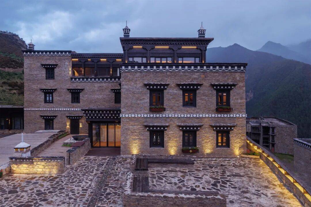 蓝月山谷(摄影:存在建筑) 村落的有机更新 在近20年来的旅游发展中,亚丁村的尺度与风貌遭到破坏,以恢复地方传统为目标,我们对亚丁村现有建筑进行分区评估:村内62栋建筑分为4类,其中保护19栋、一般修复25栋、重点整改11栋、危房拆除7栋。保护与一般修复适用于传统藏房,仅对局部构件进行更新替换;重点整改则针对租赁利益驱使下建筑体量过大,成品门窗与砌块的外观粗陋的状况,以恢复稻城地区“黑门黑窗+石砌外墙”的黑藏房传统。设计团队选取了一栋民宅进行试点,拆除了危房结构进行原址复建,在保留原住民居住空间的情况下,增加了12间客房对外运营,以平衡建设资金,为村民自建提供示范引导。