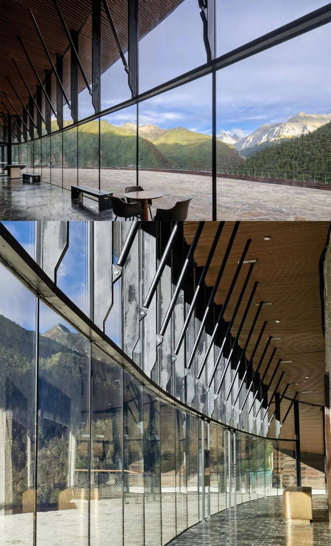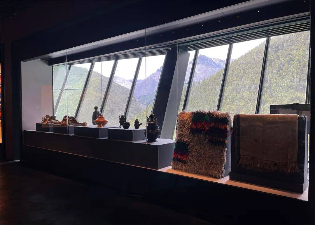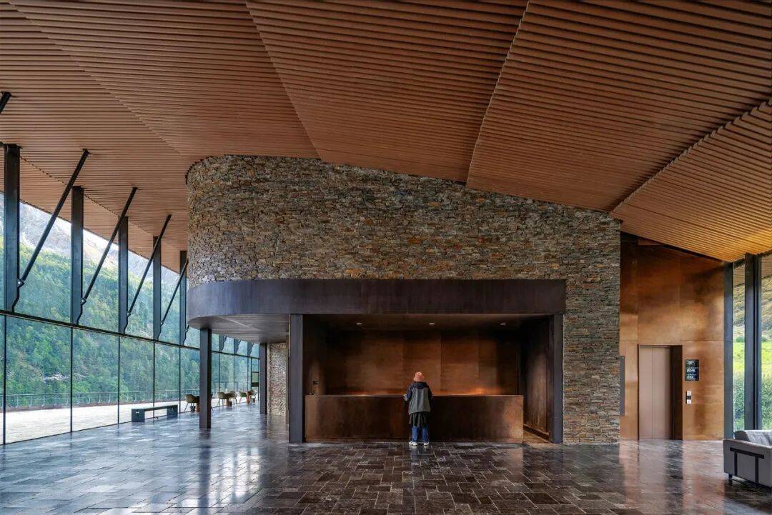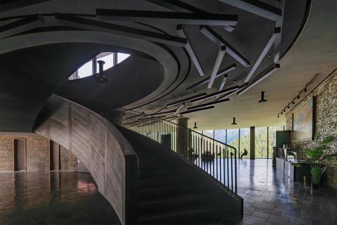 博物馆展厅(摄影:广东省集美设计工程有限公司) 有别于传统封闭模式,博物馆设计将雪山壮美的景观串联在参观流线中,建筑融入环境,模糊了内外空间的界限。从碎石板铺装的三层观景平台,步入博物馆门厅,一面连续的弧线玻璃墙将雪山全景纳入视野。为了实现最大的通透性,玻璃去掉了龙骨,上部设计了悬挂支撑的黑色钢件用于抵抗高原强风。与幕墙的轻巧形成反差,石砌外墙延续到室内,构成空间的基调。暗色的木装修反衬出户外阳光的明媚,营造出私密温暖的庇护感。顺着曲线楼梯下到二层的文创书店,这里有多种语言版本的描写香巴拉藏文化的书籍,靠窗的座位一览雪山与峡谷,点上一杯咖啡静坐,文字与美景的交融带给游客难忘的阅读体验。