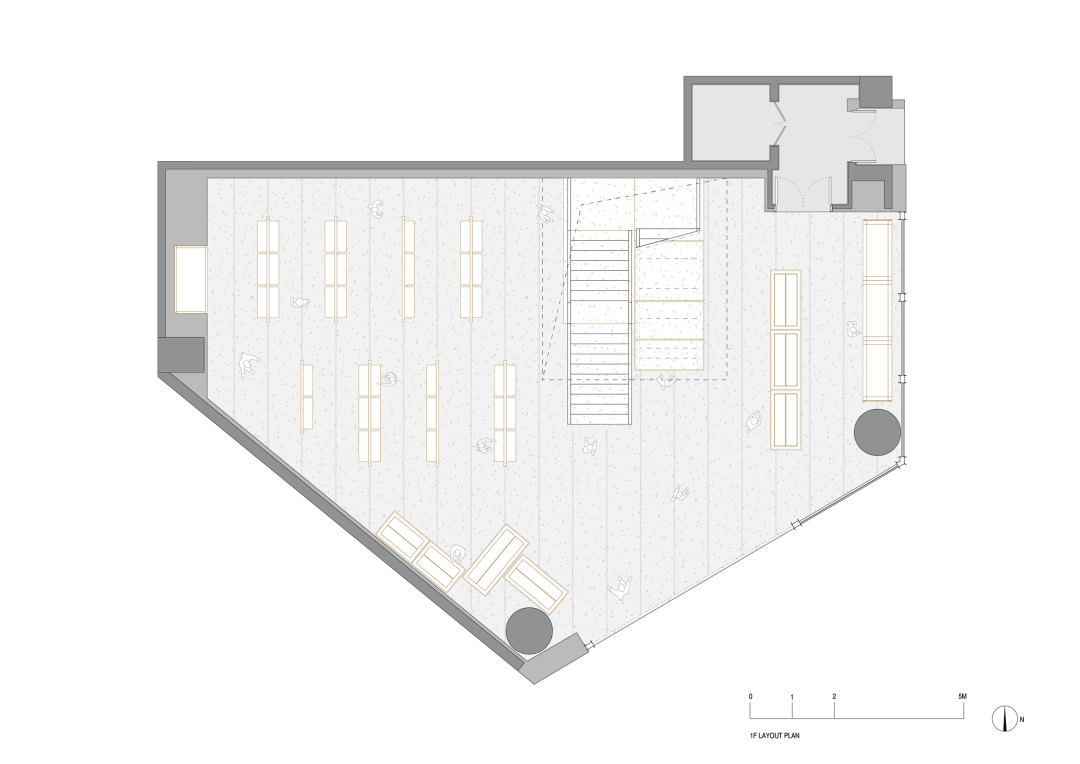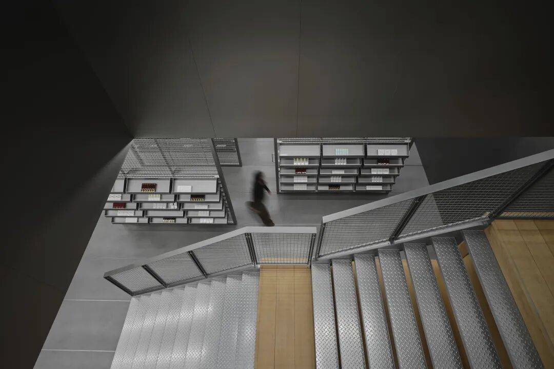 ©Seth Powers 店铺共设两层,以核心竖向动线串联空间,从视觉与动线层面打通一层与二层的连接。楼梯并未被塑造成象征性的空间节点,而是遵循仓储逻辑,以简洁的金属结构叠置于货运箱体之上,并将箱体自然嵌入台阶之中。动线、陈列与仓储体系在此融为一体,在自然引导顾客向上探索的同时,消解了传统零售空间的等级结构。